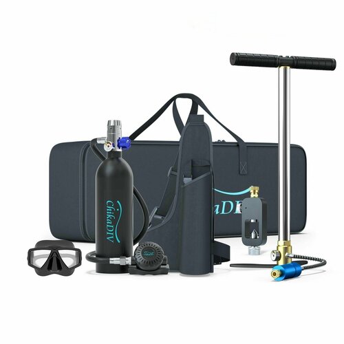 CHIKADIV C400 1L мини баллон для подводного плавания (регулятор отделен от корпуса, вам нужно будет собрать их), один подводный адаптер, одна маска для подводного плавания, портативная сумка для подводного плавания, сумка для рук, руководство пользователя и некоторые запасные аксессуары