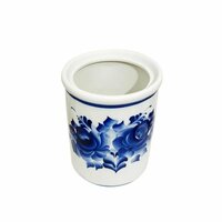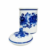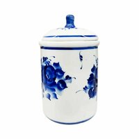 Фарфор, ручная подглазурная роспись. Эта банка сочетает в себе практичность и красоту. Будет великолепно смотреться на вашей кухне. Фарфор не впитывает запахи, поэтому вы всякий раз можете менять содержимое банки и хранить в ней даже самые ароматные специи. Банка также подойдет для хранения меда. Банка не герметична. Силиконовых уплотнителей в крышке нет. Данное изделие можно использовать в микроволновой печи или мыть в посудомоечной машине. Обращаем ваше внимание, что роспись на всех изделиях выполнена вручную и может несколько отличаться от росписи на фото. Продукт имеет официальный штамп Гжельского фарфорового завода и золотую марку, гарантирующую высокое качество.