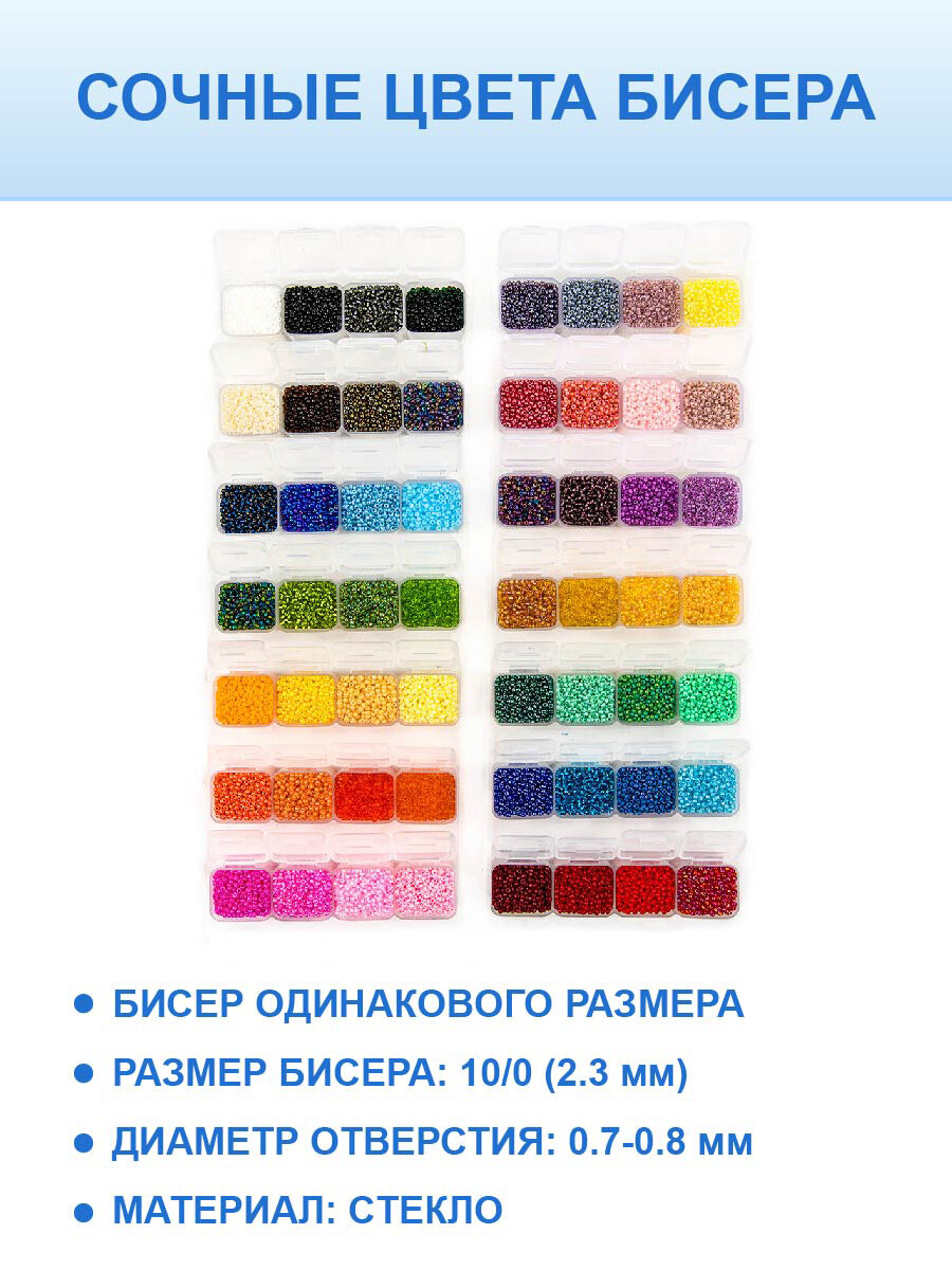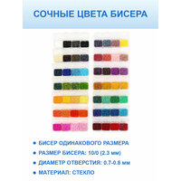 В наборе 56 цветов бисера в удобном органайзере с индивидуальной крышечкой для каждой ячейки, которая содержит 10 грамм чешского, качественного, калиброванного бисера 1 сорта, размер 10/0.