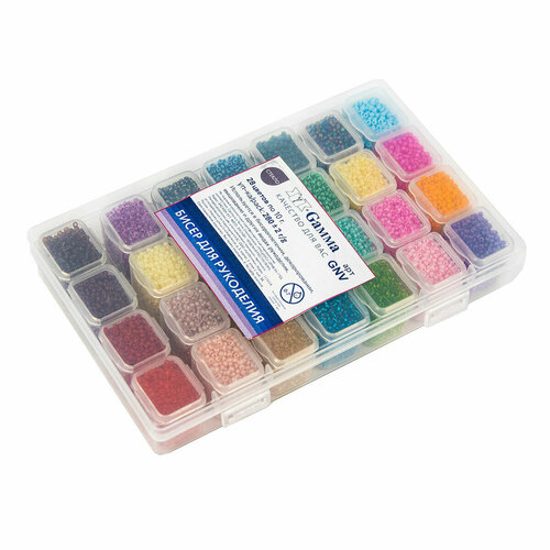 В наборе 28 разных цветов, каждый из которых находится в отдельной ячейке удобного органайзера с индивидуальной крышечкой. Бисер качественный, калиброванный, 1 сорт, размер 10/0. Органайзер надежно закрывается на защелки, чтобы бисер всегда находился под рукой и в идеальном состоянии.