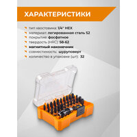 Набор предназначен для монтажа/демонтажа крепежных элементов, имеющих различные виды шлицев. В состав набора входит 30 бит различных типоразмеров - шлицевые (SL3, SL4, SL5, SL6), крестообразные (РН0, PH1, PH2, PH2, PH3, PZ0, PZ1, PZ2, PZ2, PZ3), внутренний шестигранник (HEX2, HEX2,5, HEX3, HEX4, HEX5, HEX6), Torx (Т6, ТТ7, ТТ8, ТT10, ТT15, ТT20, ТT25, ТT27, ТT30, ТT40) с шестигранным хвостовиком. В комплект также входит магнитный держатель для бит с хвостовиком 1/4“Male HEX, позволяющий легко менять биты и надёжно удерживать их в посадочном отверстии и адаптер на 1/4“Male DR. Биты выполнены из высокопрочной легированной стали S2, что обеспечивает повышенную износостойкость и увеличивает срок службы. Намагниченные наконечники облегчают крепление и фиксацию крепежа на бите. Фосфатное покрытие бит повышает износостойкость, увеличивает твердость и защищает от коррозии, что позволяет сохранять качество и внешний вид оснастки в первоначальном виде в течение долгого времени. Качественное исполнение набора позволяет рекомендовать его как опытным пользователям, так и любителям.