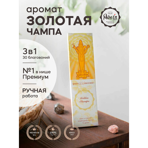 Золотая Чампа -глубокий теплый аромат душистых цветов с нотами пряного мёда. Благовония сделаны из цветов дерева Чампа (Камелия). В Индии это храмовое растение, аромат которого используется во время медитаций и богослужений.