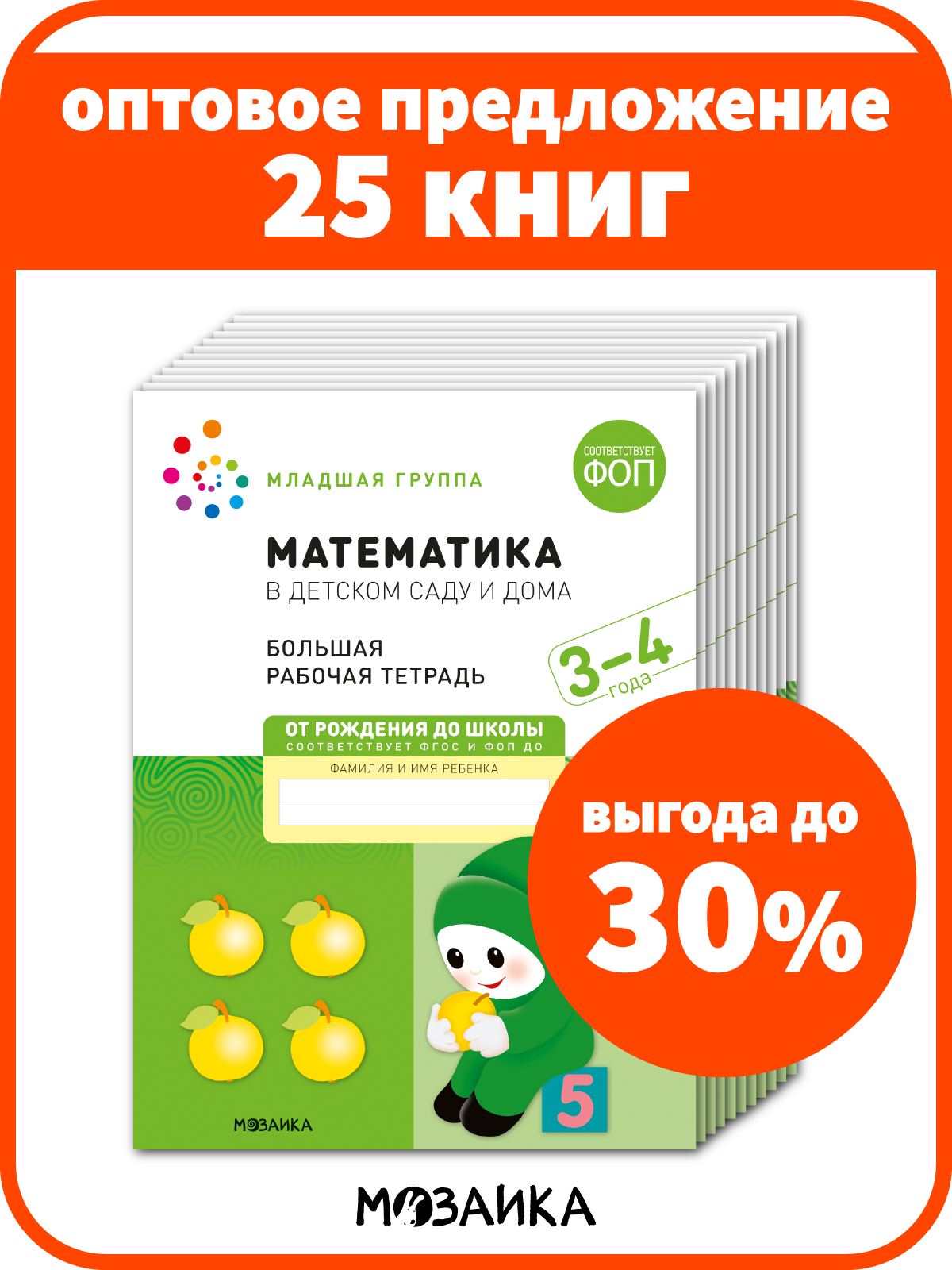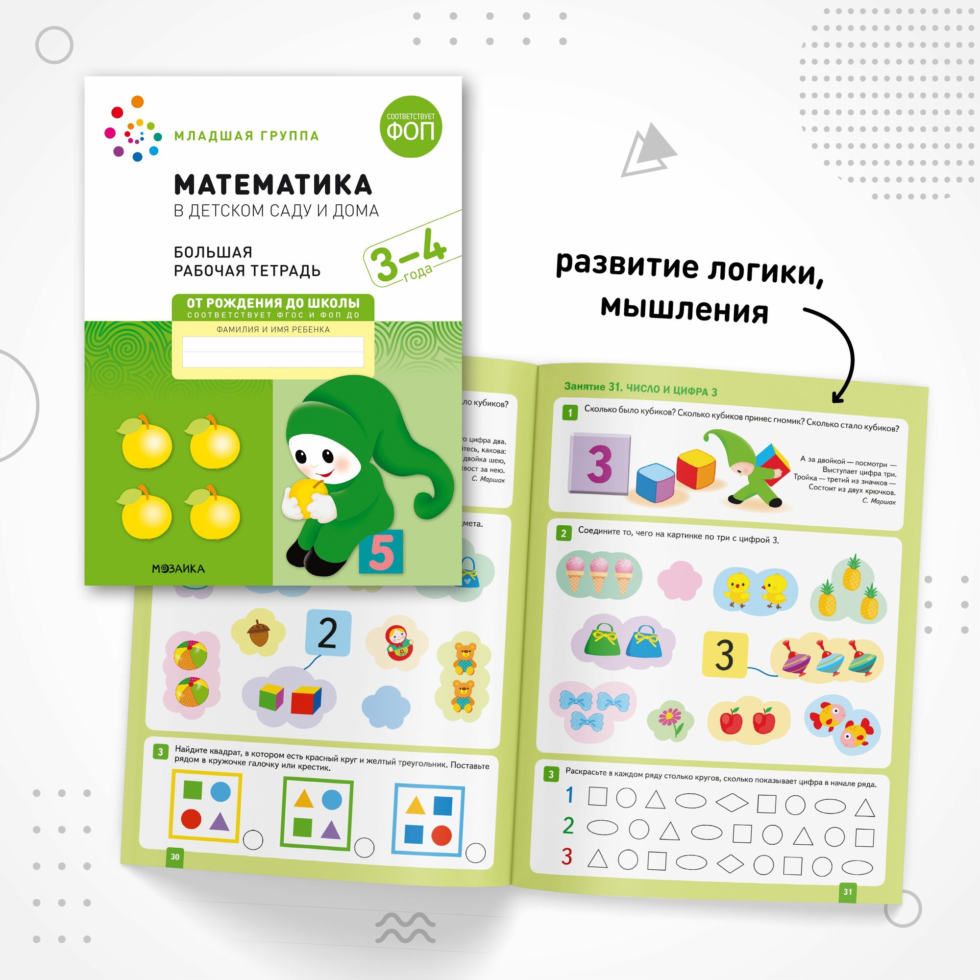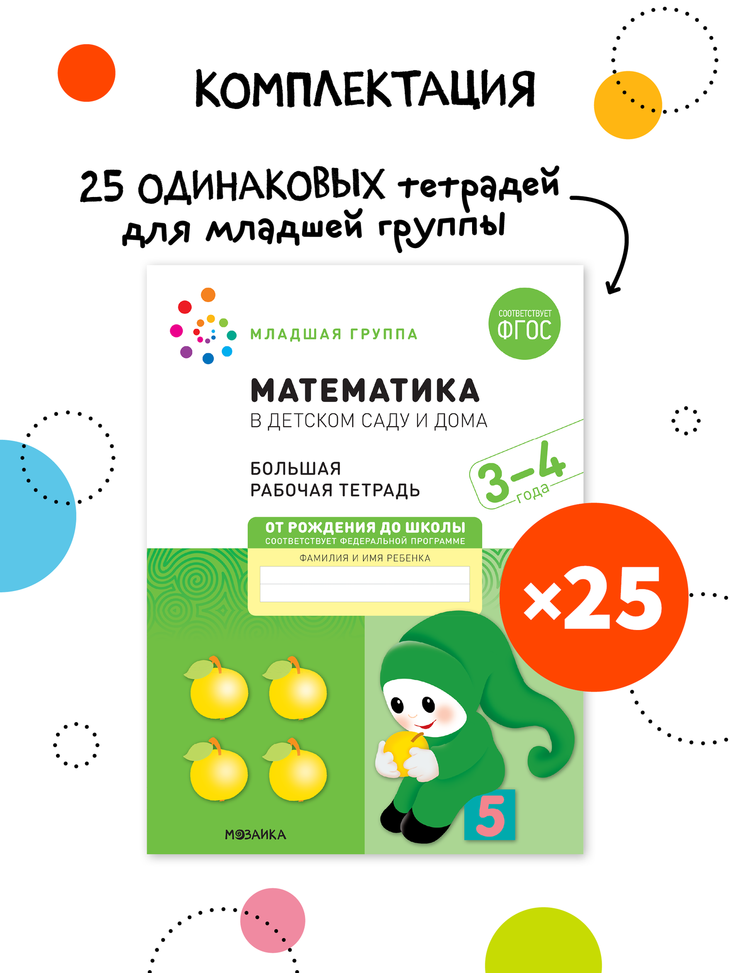 Математика в детском саду и дома. Набор из 25 одинаковых тетрадей. Большая рабочая тетрадь. 3-4 года. ФГОС Серия «Рабочие тетради» издана в рамках учебно-методического комплекта к программе «от рождения до школы». В дидактическом пособии представлен материал для закрепления и расширения математических представлений на занятиях с детьми 3–4 лет. Выполняя занимательные упражнения и задания, предложенные в тетради, дети познакомятся с простейшими геометрическими фигурами: круг, треугольник, квадрат, с понятиями «один» и «много», «ни одного». Научатся сравнивать по величине, ориентироваться в пространстве, правильно определять направление (вверх-вниз, вперед-назад), работать с множествами. Наглядные иллюстрации и увлекательные задания позволяют превратить занятие не в урок, а в интересный диалог, где ведущая роль отводится детям, в возможности рассуждать, размышлять, обосновать свое мнение. Это обеспечит не только отработку основных навыков пройденного материала, но и вызовет интерес к дальнейшему обучению. Рабочая тетрадь адресована педагогам дошкольных образовательных учреждений, а также гувернерам и родителям для занятий с детьми 3–4 летТрехлетний малыш – вечный почемучка. На четвртом году жизни продолжается интенсивное развитие психической сферы, подвижности, памяти, речи, совершенствуется ходьба и другие моторные навыки. В возрасте 3-4 лет ребенок постепенно выходит за пределы семейного круга, познает окружающий мир, заводит первые знакомства, находит друзей, при этом впитывая все как губка. Стремление к самостоятельности и возросшая потребность в общении, характерные для этого возраста, создают великолепные предпосылки для интенсивного обучения и развития ребенка. Занятия от трех лет направлены на дальнейшее развитие психомоторной, сенсорной, мыслительной, речевой и других сфер, соответствуют занятиям в младшей группе в детском саду. Программа от рождения до школы предназначена для мальчиков и девочек от 0 до 7 лет. Обучающие задания разработаны в соответствии с современными образовательными стандартами и будут полезны как родителям, так и воспитателям. Созданы командой детских педагогов и психологов для гармоничного всестороннего развития дошколят. Для дополнительного развития интеллекта речи мышления ребенка, чтения по слогам формы мелкой моторики меры величины логики внимания творческих способностей расширения кругозора разработаны специальные издания. В издательстве представлены учебно-методические материалы для планирования работы педагогов дошкольного образования, логопедов, дефектологов, охватывающий весь объем знаний и заданий необходимых для раннего воспитания и развития ребенка, а так же познавательные книжки для малышей. В широком ассортименте детские развивающие интересные книги и рабочие тетради по математике, развитию речи, развитию речевого и фонематического восприятия, счету, прописи, грамоте, учебники по рисованию, лепке, аппликации, экологическому воспитанию, ознакомление с окружающим миром, методические пособия, наглядно-дидактические материалы, планы физкультурных занятий, уроки для дошкольников, развивашки для детей, тематическое планирование, конспекты и сценарии занятий рекомендованные ФГОС, инновационная программа дошкольного образования. Полученные знания станут