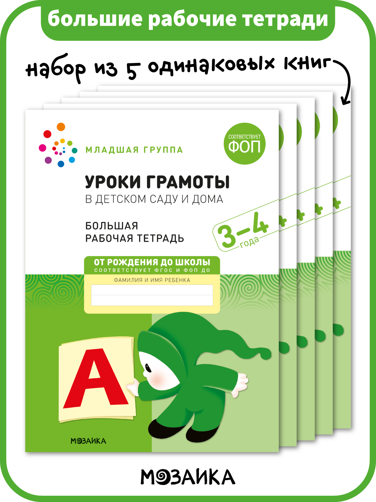 Уроки грамоты в детском саду и дома. Набор из 5 одинаковых тетрадей. Большая рабочая тетрадь. 3-4 года. ФГОС. Серия рабочие тетради издана в рамках учебно-методического комплекта к программе «от рождения до школы». Рабочие тетради направлены на развитие фонематического слуха у детей 3-4 лет. В тетради представлены чистоговорки, загадки, рифмы, стишки для работы со звуками, что помогает улучшить произношение у детей. В книге каждое занятие посвящено одному звуку. Выполняя задания, предложенные в тетради, дети учатся определять местоположение звука в слове, совместно с воспитателем правильно его произносить и находить картинки с заданным звуком. Предназначена воспитателям ДОО, педагогам дополнительного образования, родителям. Трехлетний малыш – вечный почемучка. На четвртом году жизни продолжается интенсивное развитие психической сферы, подвижности, памяти, речи, совершенствуется ходьба и другие моторные навыки. В возрасте 3-4 лет ребенок постепенно выходит за пределы семейного круга, познает окружающий мир, заводит первые знакомства, находит друзей, при этом впитывая все как губка. Стремление к самостоятельности и возросшая потребность в общении, характерные для этого возраста, создают великолепные предпосылки для интенсивного обучения и развития ребенка. Занятия от трех лет направлены на дальнейшее развитие психомоторной, сенсорной, мыслительной, речевой и других сфер, соответствуют занятиям в младшей группе в детском саду. Программа от рождения до школы предназначена для мальчиков и девочек от 0 до 7 лет. Обучающие задания разработаны в соответствии с современными образовательными стандартами и будут полезны как родителям, так и воспитателям. Созданы командой детских педагогов и психологов для гармоничного всестороннего развития дошколят. Для дополнительного развития интеллекта речи мышления ребенка, чтения по слогам формы мелкой моторики меры величины логики внимания творческих способностей расширения кругозора разработаны специальные издания. В издательстве представлены учебно-методические материалы для планирования работы педагогов дошкольного образования, логопедов, дефектологов, охватывающий весь объем знаний и заданий необходимых для раннего воспитания и развития ребенка, а так же познавательные книжки для малышей. В широком ассортименте детские развивающие интересные книги и рабочие тетради по математике, развитию речи, развитию речевого и фонематического восприятия, счету, прописи, грамоте, учебники по рисованию, лепке, аппликации, экологическому воспитанию, ознакомление с окружающим миром, методические пособия, наглядно-дидактические материалы, планы физкультурных занятий, уроки для дошкольников, развивашки для детей, тематическое планирование, конспекты и сценарии занятий рекомендованные ФГОС, инновационная программа дошкольного образования. Полученные знания станут настоящими помощниками для будущих школьников.