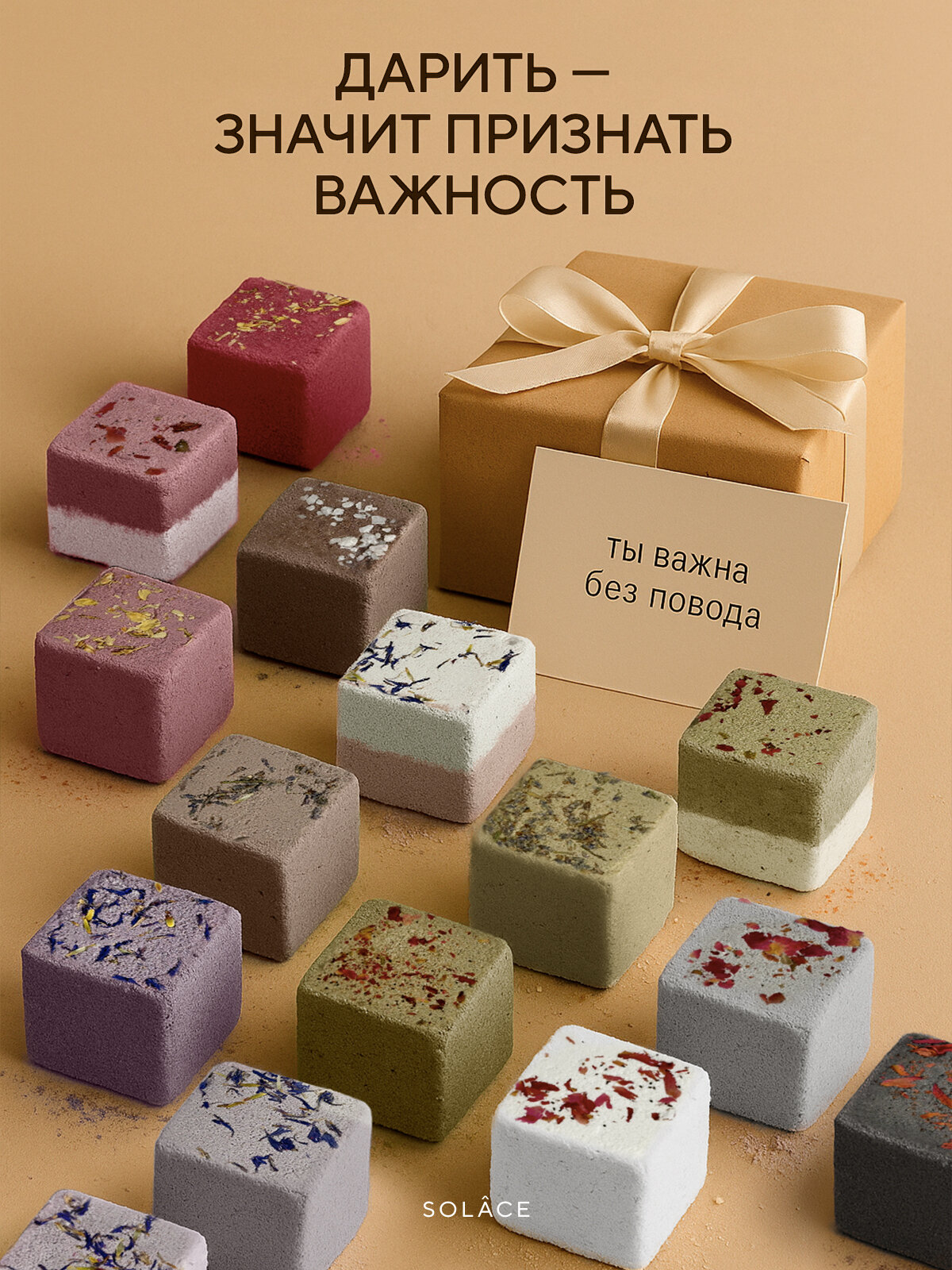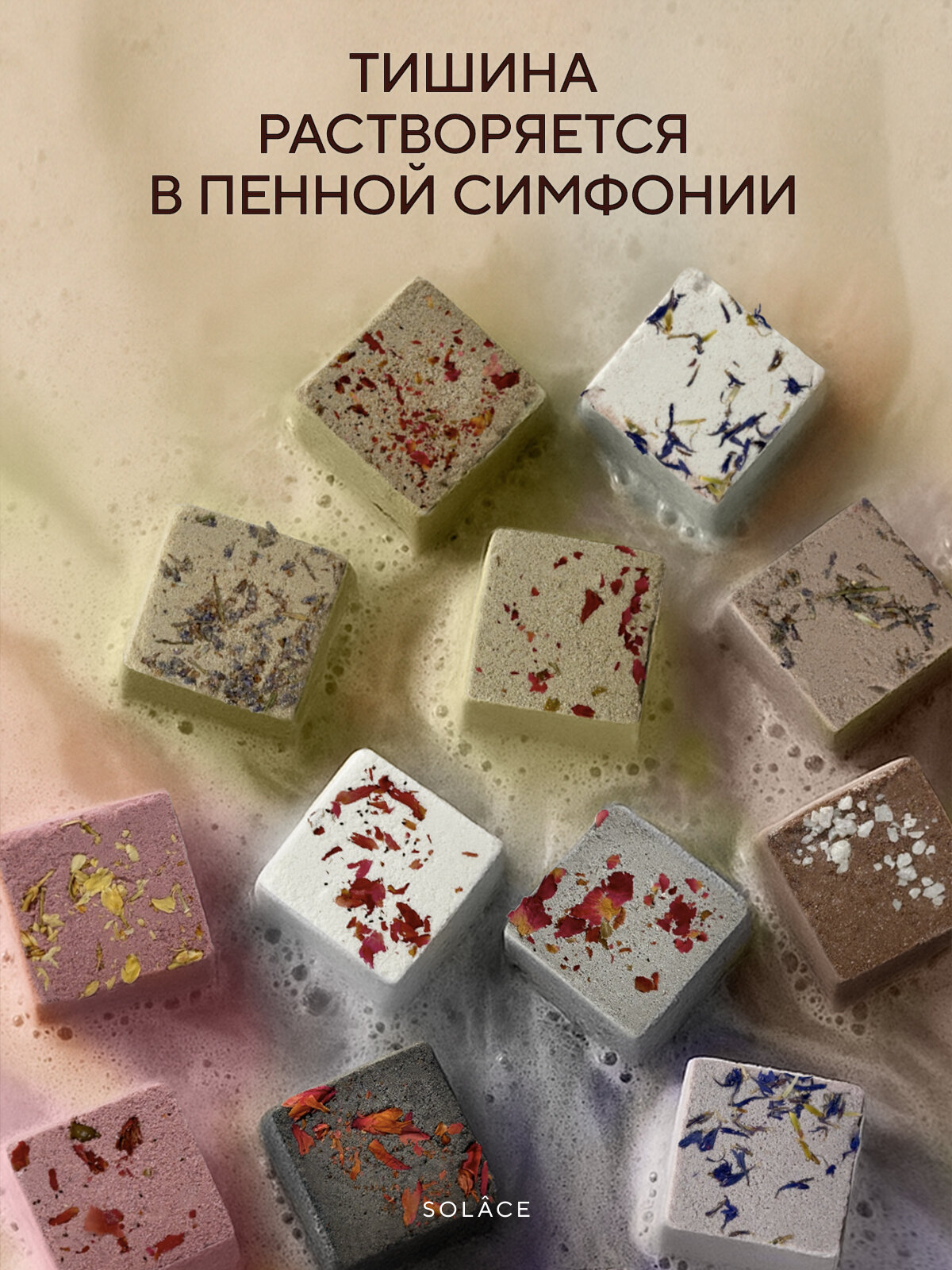 Погрузитесь в мир расслабления с набором бомбочек для ванны Solace — 15 шипучих кубиков ручной работы с шиммером, морской солью и сухоцветами. Каждая бомбочка — это натуральный уход за кожей и ароматерапия, превращающая ванну в домашний SPA.