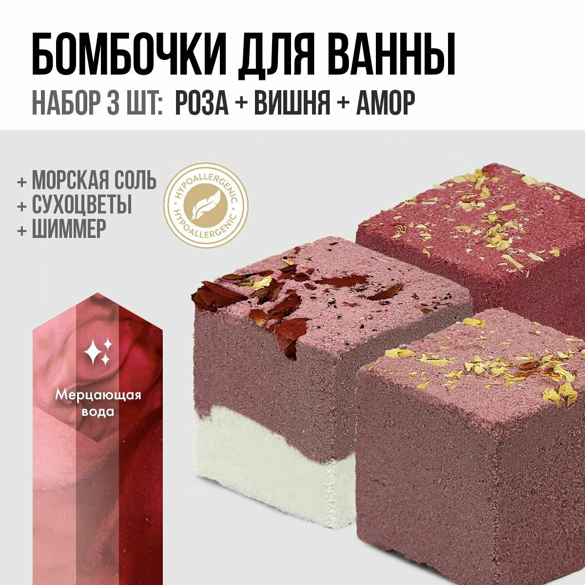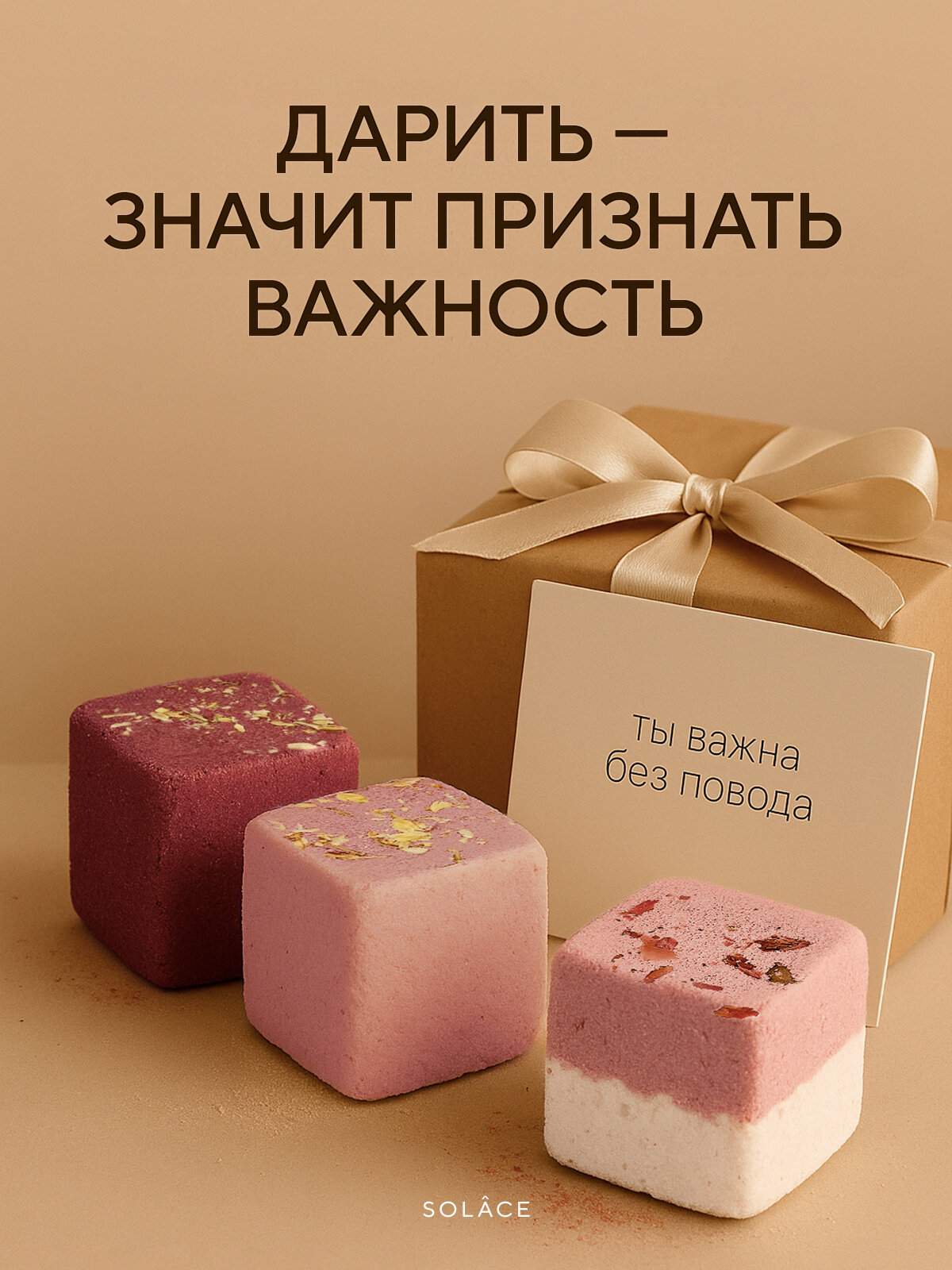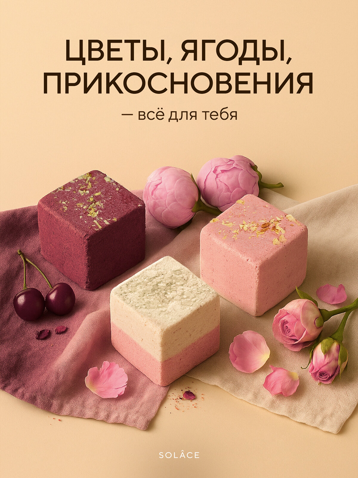Набор Solace Red создан для тех, кто ищет яркие эмоции, чувственные ароматы и заботу. В наборе три бомбочки ручной работы: роза, амор и вишня. Все они наполнены природными ингредиентами: морская соль, сухоцветы, шиммер. Эти кубики превращают ванну в атмосферу уюта, романтики и глубины. Ароматы усиливают настроение и ощущение женственности. Подарите себе вечер замедления или порадуйте близкого человека. Бомбочки легко упаковать в подарочную коробку — они эстетичны, практичны и подойдут для подарка на любой повод.