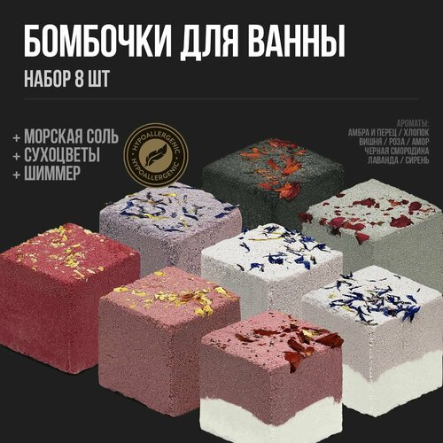 Это не просто бомбочки для ванны, это невероятное погружение в роскошь и удовольствие. Эти кубические бомбочки размером 5х5х5 см представляют собой идеальное сочетание минимализма и элегантности. Их пастельная цветовая гамма и стильный дизайн привлекут внимание ценителей изысканности. Натуральный состав без излишеств превращает обычную ванну в настоящий релаксационный СПА опыт. В каждой бомбочке содержится морская соль, сухоцветы и мерцающий шиммер, благодаря которому вода становится перламутровой, словно шелк, создавая атмосферу умиротворения и расслабления. Это необходимый шаг к заботе о себе, который помогает восстановить баланс после напряженного дня и подарить себе заслуженное внимание. Ароматы: