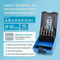 Набор твердосплавных борфрез NORGAU Industrial Режущие головки 10 мм. Применяются для обработки металлических изделий. Режуща головка борфрез изготовлена из мелкозернистого твердого сплава, соединяется высококачественной пайкой с хвостовиком из инструментальной стали. Хвостовик D6х45мм. Двойная заточка DCM обеспечивает высокую производительность и большой съем материала. При обработке образуется мелкая стружка. В комплекте 10 борфрез наиболее популярных форм и размеров для общего применения: A1020, B1020, C1020, D1009, E1016, F1020, G1020, H1019, L1025, M1020.