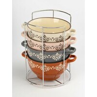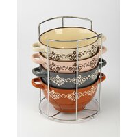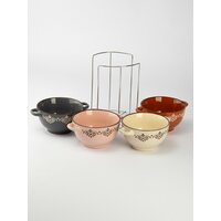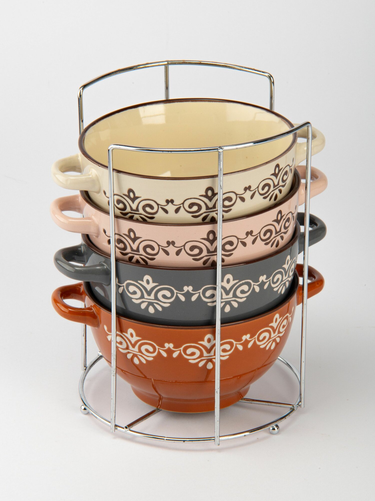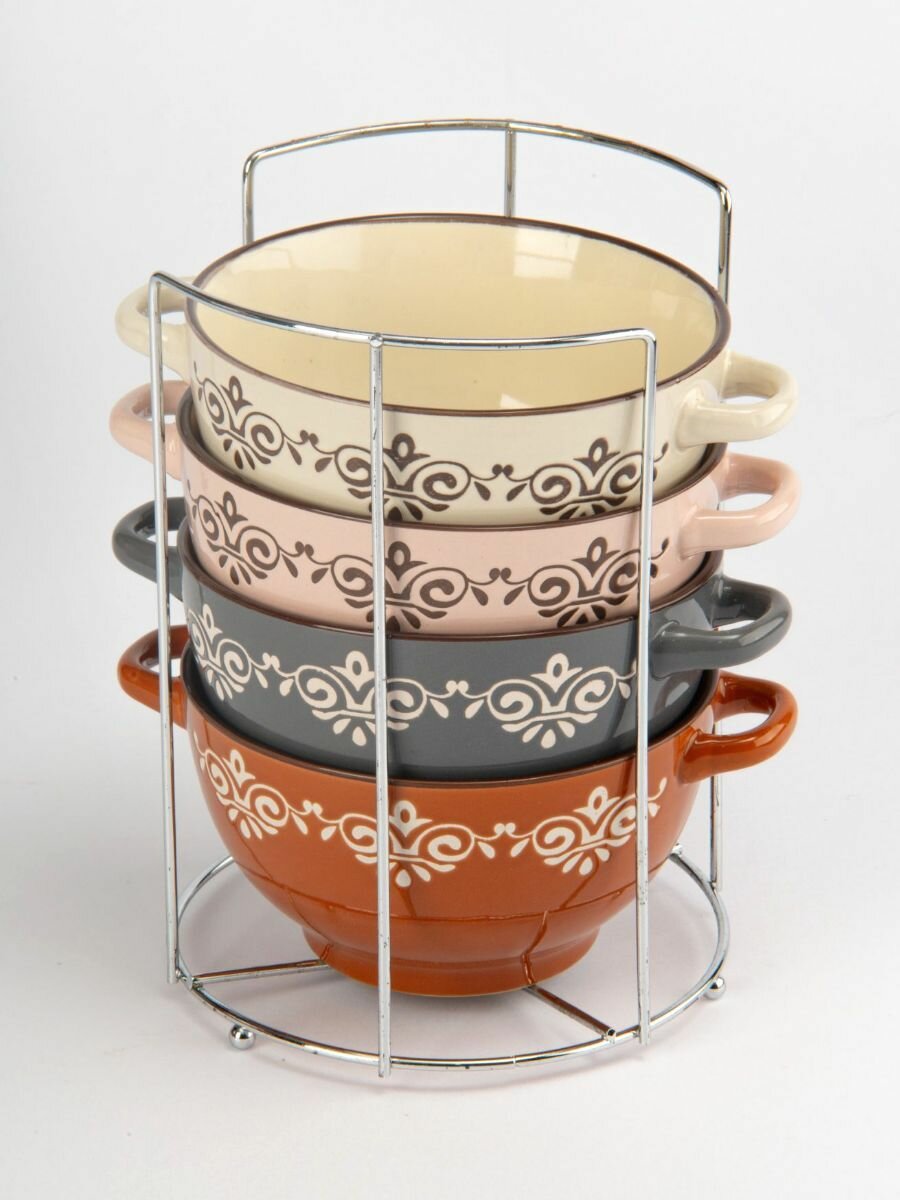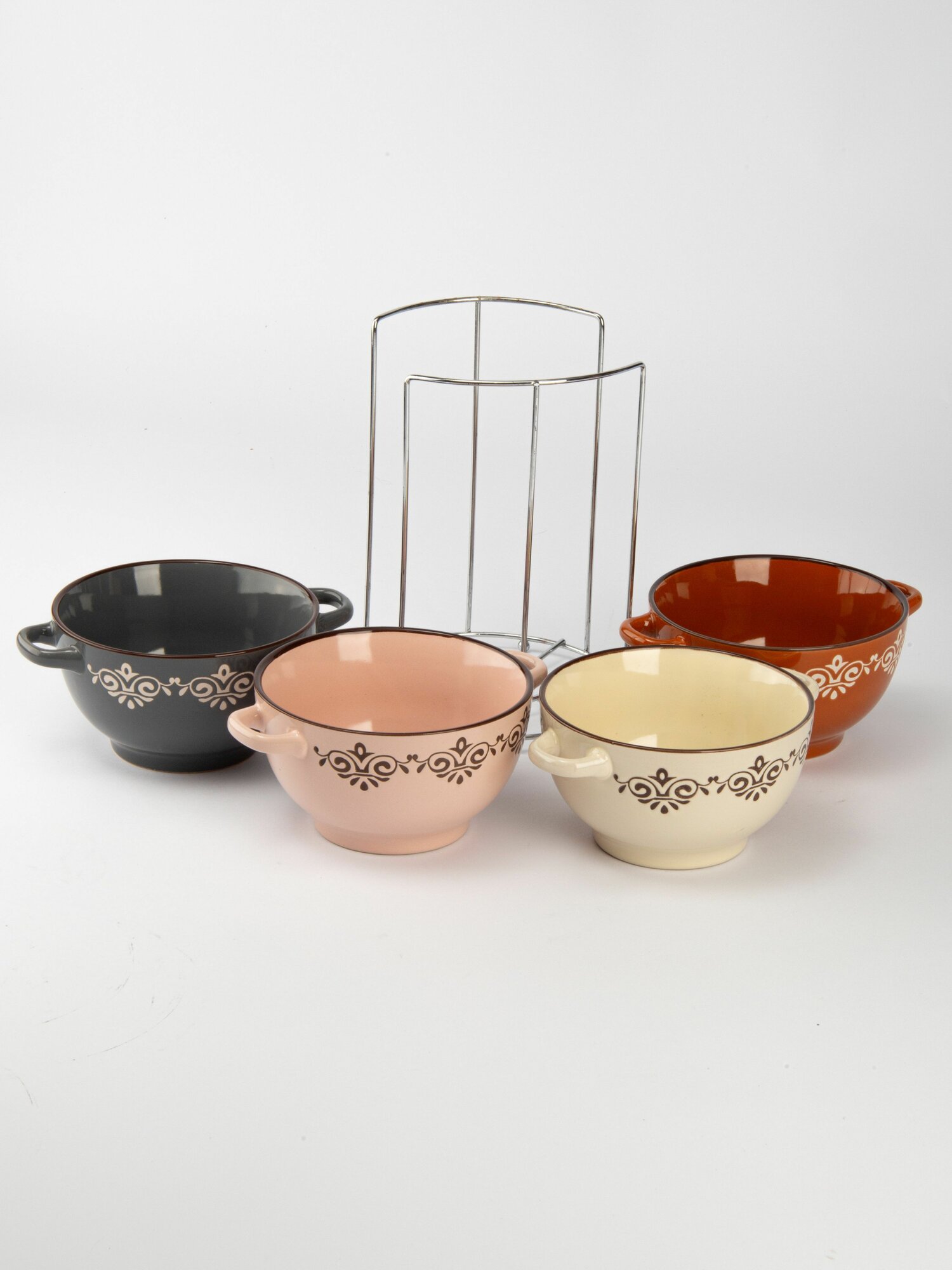 Представляем вашему вниманию изысканный набор бульонниц различных оттенков, размещенных на элегантной металлической подставке. Этот комплект станет настоящим украшением вашего стола, добавив нотку стиля и уюта в любую трапезу. Бульонницы выполнены из керамики, материал абсолютно безопасен для здоровья, не выделяет вредных веществ. Металлическая подставка обеспечивает устойчивость и удобство использования, а также защищает поверхность стола от возможных повреждений. Набор идеально подойдет как для семейных обедов, так и для торжественных мероприятий, подчеркивая ваш безупречный вкус и внимание к деталям.