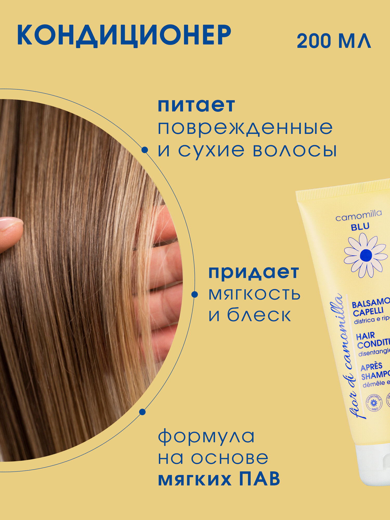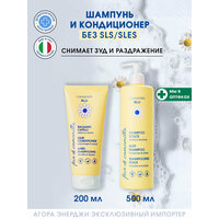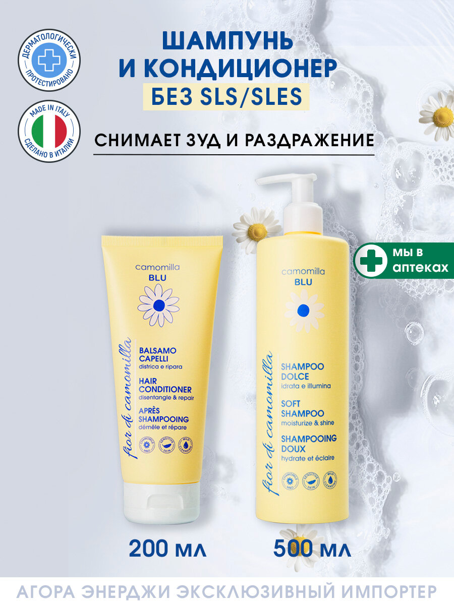 Набор для ухода за волосами Camomilla Blu. Комплектация: мягкий шампунь и кондиционер. Шампунь против зуда деликатно очищает, соблюдая естественный гидробаланс кожи головы. В составе только мягкие, биоразлагаемые ПАВ – производные кокосового масла. После использования локоны блестящие, напитанные, обретают ухоженный внешний вид. Бальзам глубоко питает, распутывает и разглаживает, обеспечивает мягкость. Предназначен для поврежденных, сухих и ломких локонов. Рекомендуется наносить на влажные пряди от середины длины и до кончиков. Обладает свежим ароматом с легкими сладкими нотами. Формула средств на основе высокого содержания гидролата ромашки, который дистиллирован компанией M&D Pharmacy. Цветочная вода отличается повышенной концентрацией полезных веществ и эфирных компонентов растения, которые насыщают и интенсивно увлажняют. В результате более плотные, здоровые и шелковистые локоны, которые легче расчесываются. Без минеральных масел, сульфатов, парабенов, синтетических красителей, искусственных отдушек и ароматизаторов. Подходят для всей семьи, идеально для окрашенных и мелированных волос. Разрешены для чувствительной кожи и частого применения. Изготовлено в Италии.