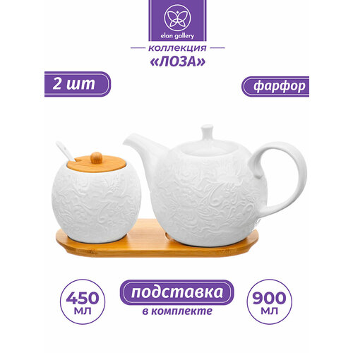 Набор Elan Gallery "Лоза" на бамбуковой подставке выполнен из белого фарфора и украшен рельефным узором. Этот комплект станет воплощением прекрасного вкуса и поможет создать уют в вашем доме. В комплект входят: чайник заварочный объёмом 900 мл и сахарница 450 мл с бамбуковой крышкой и фарфоровой ложкой. Сахарницу можно использовать как баночку с крышкой для меда, варенья, орешков или икры. Чайник оснащен фильтром в виде маленьких отверстий в стеночке, благодаря которому вы сможете наслаждаться ароматной заваркой без попадания мелких чаинок. На фарфоровой крышке с обратной стороны есть небольшой выступ, чтобы она хорошо держалась на чайнике. Праздничный набор подходит для любителей чёрного, зелёного или травяного чая. Вы сможете удивить своих гостей красивой сервировкой стола как в будни, так и на праздник. Не рекомендуется применять абразивные моющие средства. Без бамбуковых деталей можно использовать в микроволновой печи и посудомоечной машине. Бамбук нельзя замачивать! Поставляется в стильной картонной упаковке. Подарите чайный комплект своим близким. Его красивый дизайн и функциональность оценит каждая хозяйка, а высокое качество фарфора и бамбука обеспечат долговечность этого подарка.