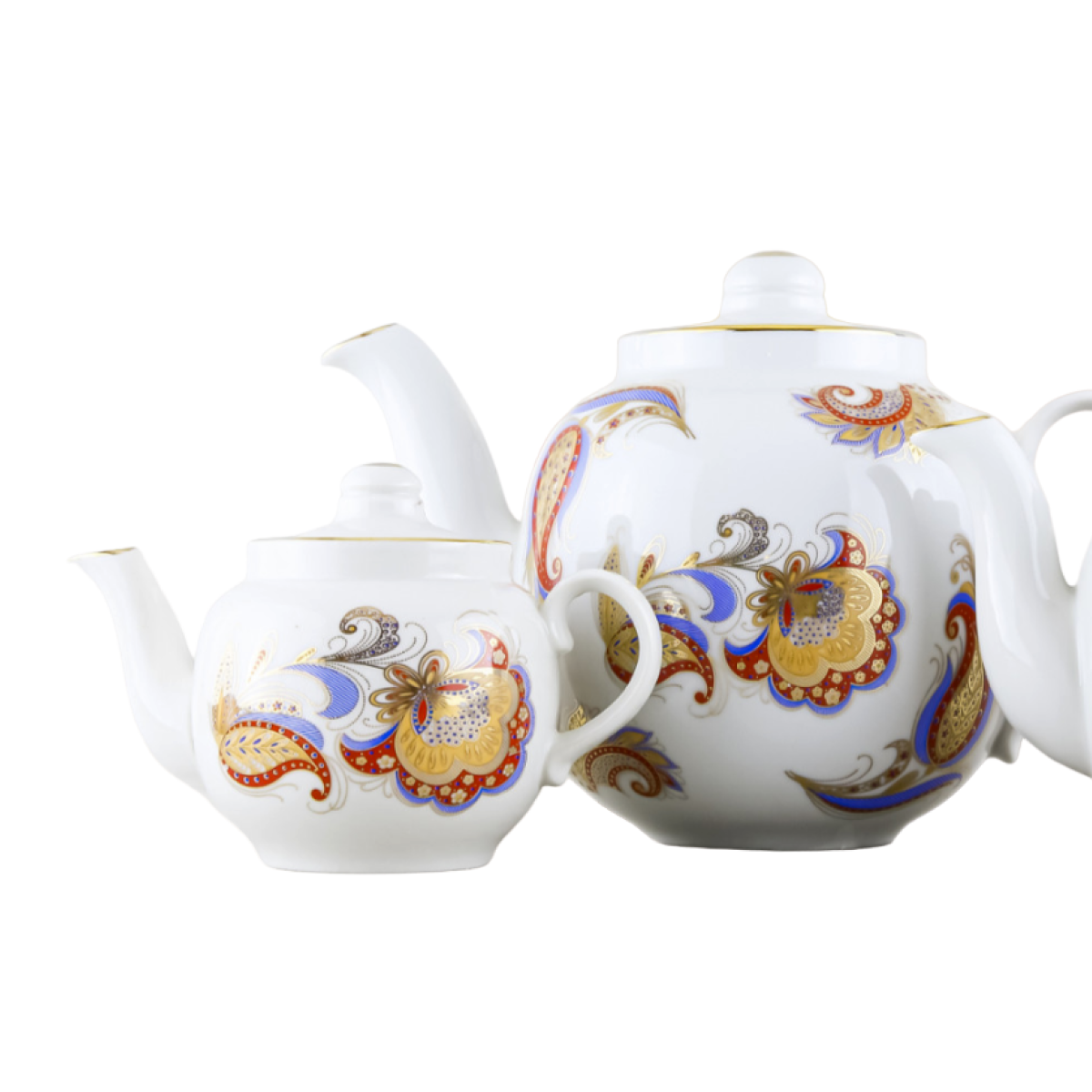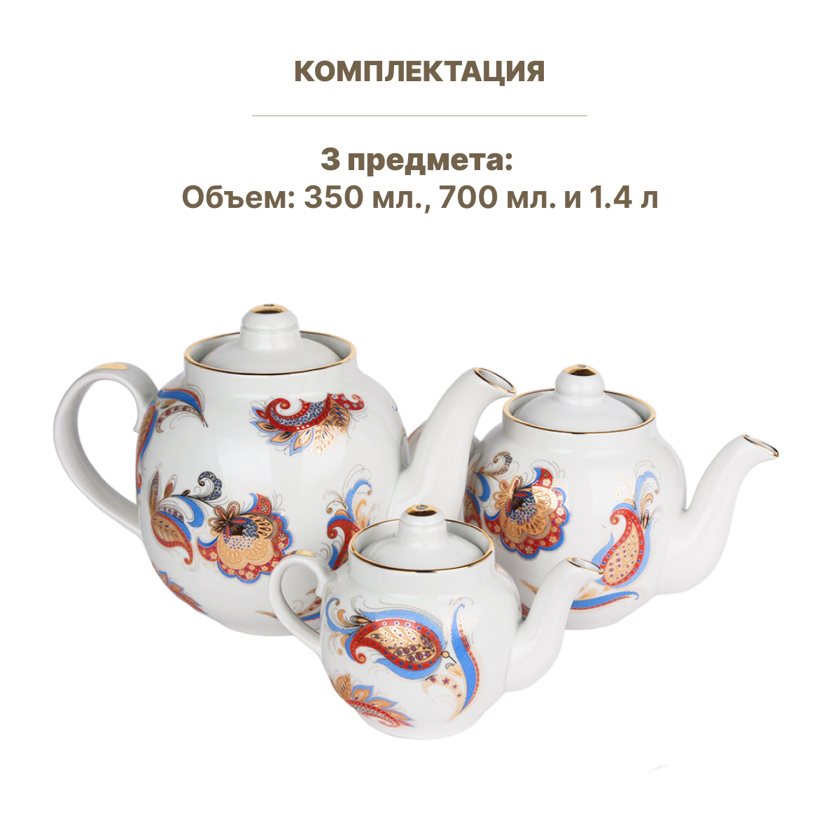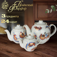 Дулевский фарфор на протяжении двух веков - визитная карточка декоративно-прикладного искусства России. Завоевал огромное количество призов на различных мировых выставках, удивляя весь мир неповторимостью русского стиля. Фарфор ручной работы, передающийся из поколение в поколение и становящийся с возрастом все ценнее, долгие годы не теряет своих свойств. Обратите внимание! Производитель выпускает изделия согласно требованиям ГОСТ, допускающим наличие наколов, черных точек и вкраплений до 1 мм на изделиях, в т. ч. на лицевой стороне. Это не является браком. Набор из 3-х чайников из фарфора "Форма: Янтарь. Рисунок: Перо Жар-птицы" - это высокое качество материала и изумительная роспись, с отводкой из 24-каратного золота. Заварочные чайники имеют изящную форму, а качество росписи позволяет краскам оставаться яркими долгие годы. Фарфоровые чайники смогут стать настоящим украшением кухни или приятным подарком для ваших близких! Набор состоит из 3-х чайников объёмом 350 мл, 700 мл. и 1.4 л.