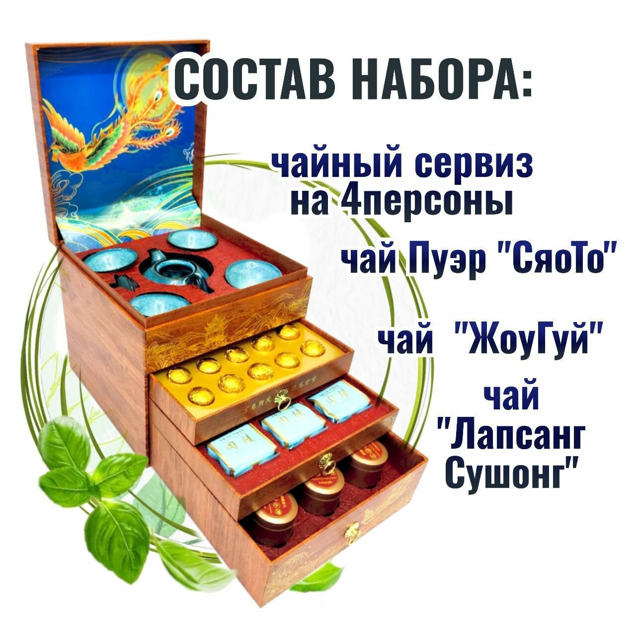 Подарочный набор состоит из четырех уровней в деревянной коробке , в которых размещены знаменитые виды китайских чаев высокого качества: Лапсанг сушонг красный рассыпной китайский чай, крупноглистовой, Жоу Гуй (Нефритовая корица) рассыпной китайский листовой чай, Пуэр Сяо То пресованный красный китайский чай листовой и традиционный китайский керамический чайный сервиз ручной работы чайных мастеров.