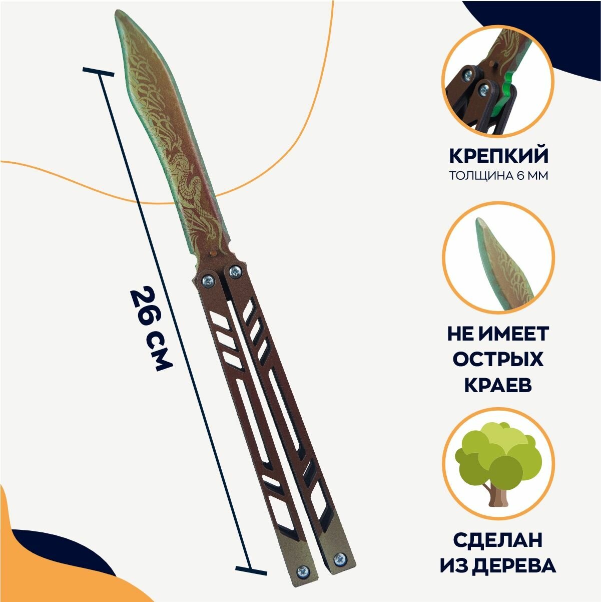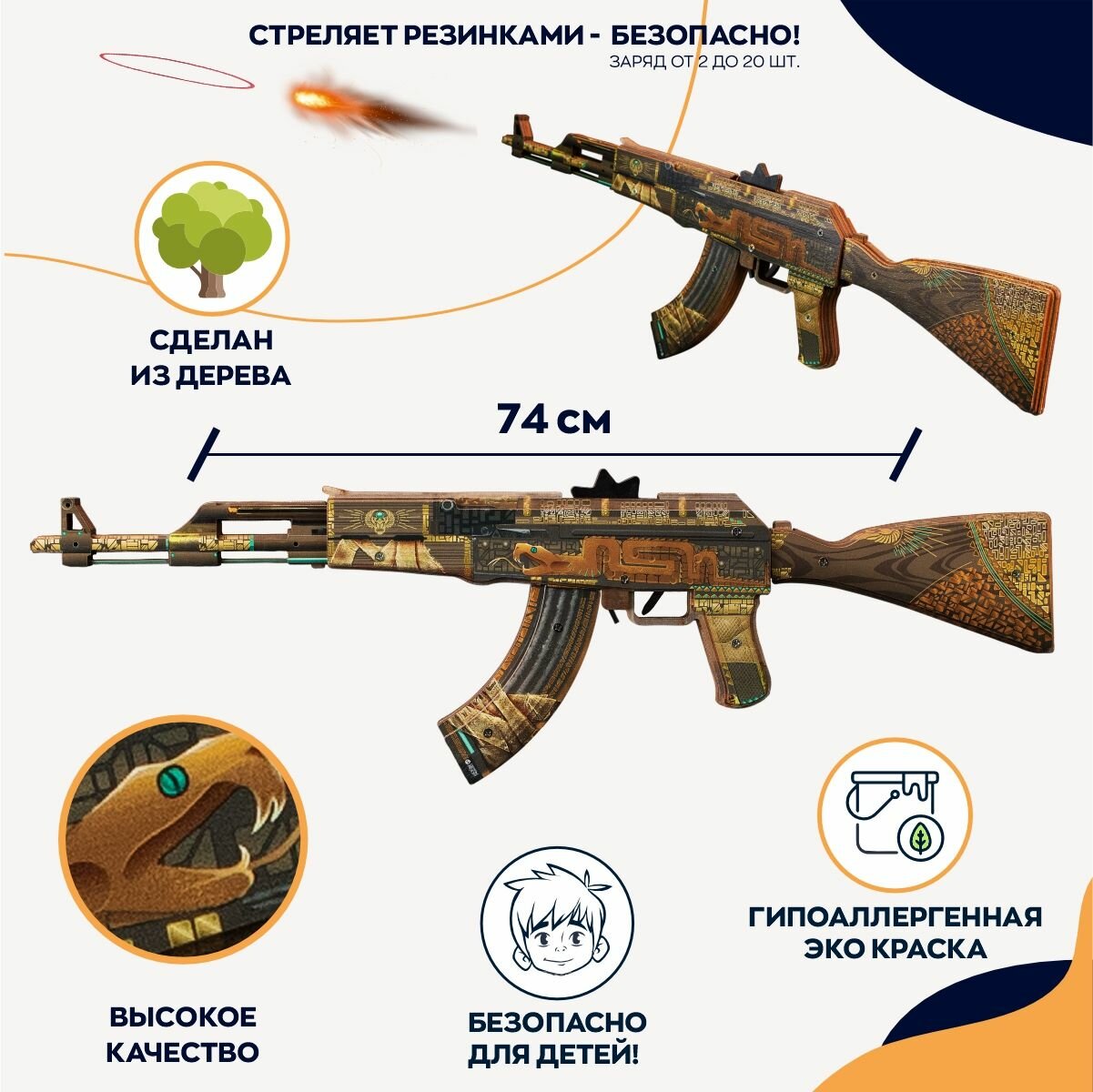 Подарочный набор игрушечного оружия вызовет восторг у ребенка! Каждый комплект уникален, дополнен наклейками, отличается составом и скинами, что позволяет выбрать наиболее подходящий подарок для каждого мальчика. Ножи из дерева - точная и реалистичная копия из популярной видеоигры. Деревянные сувениры будут активно использоваться для игр на свежем воздухе (улице, даче или дома). Игрушка нож может быть использована для тренировок, отработки трюков и навыков самообороны. Складной ножик бабочка тренировочная с клинком, окрашен эко красками, покрыт прямой печатью и защищен слоем водонепроницаемого лака, чтобы увеличить срок службы изделия. Игрушечный нож изготовлен специально для трюков или флиппинга, подходит для развития мелкой моторики рук ребенка. Сабля танто крепко держится в ножнах с помощью магнита. Самурайский кинжал с ножнами создан по уникальному макету, обладает реалистичным видом, но с ним не страшно оставить мальчика поиграть самостоятельно, он полностью безопасен и не токсичен (острые углы отсутствуют Резинкострелы развивают меткость, ловкость, внимание, воображение, предрасполагает к сюжетно-ролевым играм, улучшает координацию движений, учит тактике, стратегии и хитрости. АКР разнообразит игры, открыв простор для создания многочисленных увлекательных игровых сюжетов. Ружье не стреляет пульками, поэтому с ним безопасно играть в войнушку, воздушный тир или пострелять по мишеням. Калашников стреляет резинками на расстоянии до 10 метров за счет движения шестерни (при покупке ak47, вы получаете комплект резинок в подарок). Макет ak 47 из дерева легко собирается и разбирается, им можно стрелять очередью (заряжать до 20 резинок) или поштучно. USP-S с глушителем и точным прицелом, из популярной компьютерной игры CS GO (КС ГО), обязательно понравится геймерам всех возрастов. Ненастоящее оружие дезерт игл или пустынный орёл, является абсолютно безопасным для детей. Самоклеящиеся виниловые стикеры по мотивам популярной игры на пленке формата А5. На картинках ты узнаешь своих любимых героев из игровой вселенной. Все декоративные stickers уникальны и отличаются друг от друга, каждый вырезан по контуру, что позволяет их удобно отклеивать. подходит для украшения канцтоваров (блокнот, альбом, ежедневник, тетрадь, школьный и личный дневник, пенал, папка). Эстетичные изделия с клейким основанием красиво смотрятся на чехле телефона (айфона, смартфона), украсят планшет, айпад повербанк, наушники и различные гаджеты. Наклейка интерьерная - отличный декор детской и комнаты подростка, можно клеить на любые плоские поверхности: на стену, на стол, на дверь, на комод.Круто подходят для украшения оружия! Новогодний набор можно выбрать из: Автомат АК47 Dragon glass, пистолет desert eagle yakuza, нож tanto якудза, нож kunai radiation; Ak 47 Трежер хантер, бабочка Легаси, танто якудза; AK-47 Necromanser, USP genesis, керамбит cold flame, нож бабочка coldflame; AK 47 2 Years red, юсп 2 года красный, karambit claw, бабочка коготь. Изготавливаются на собственном производстве в России из натуральных материалов, с преобладанием ручного способа изготовления. Прекрасный презент на новогодние праздники (нг), Рождество, день рождения, 23 февраля и любое другое событие.