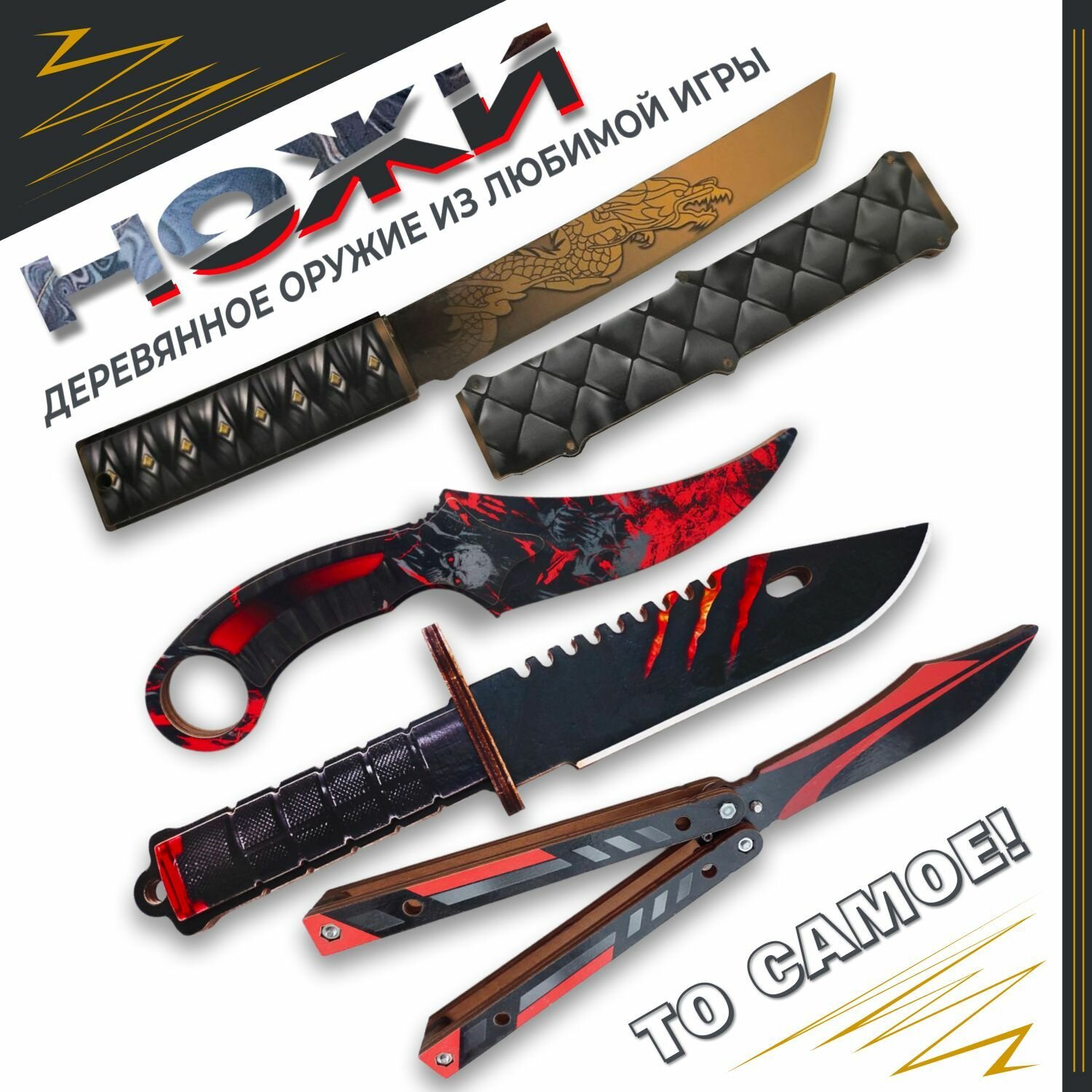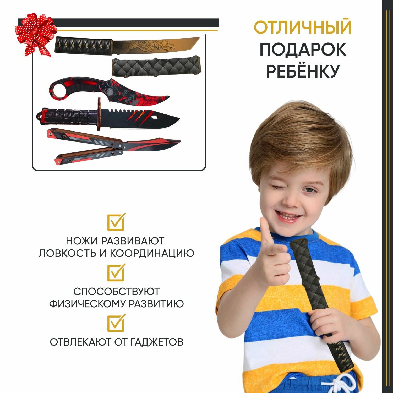 Игрушечные ножи изготовлены из прочной деревянной основы, без острых углов, тщательно отшлифованы. ЭКО материалы высокого качества не имеют посторонних запахов. Скины напечатаны стойкими нетоксичными краскам. Игровое оружие покрыто защитной пленкой, чтобы избежать истирания.