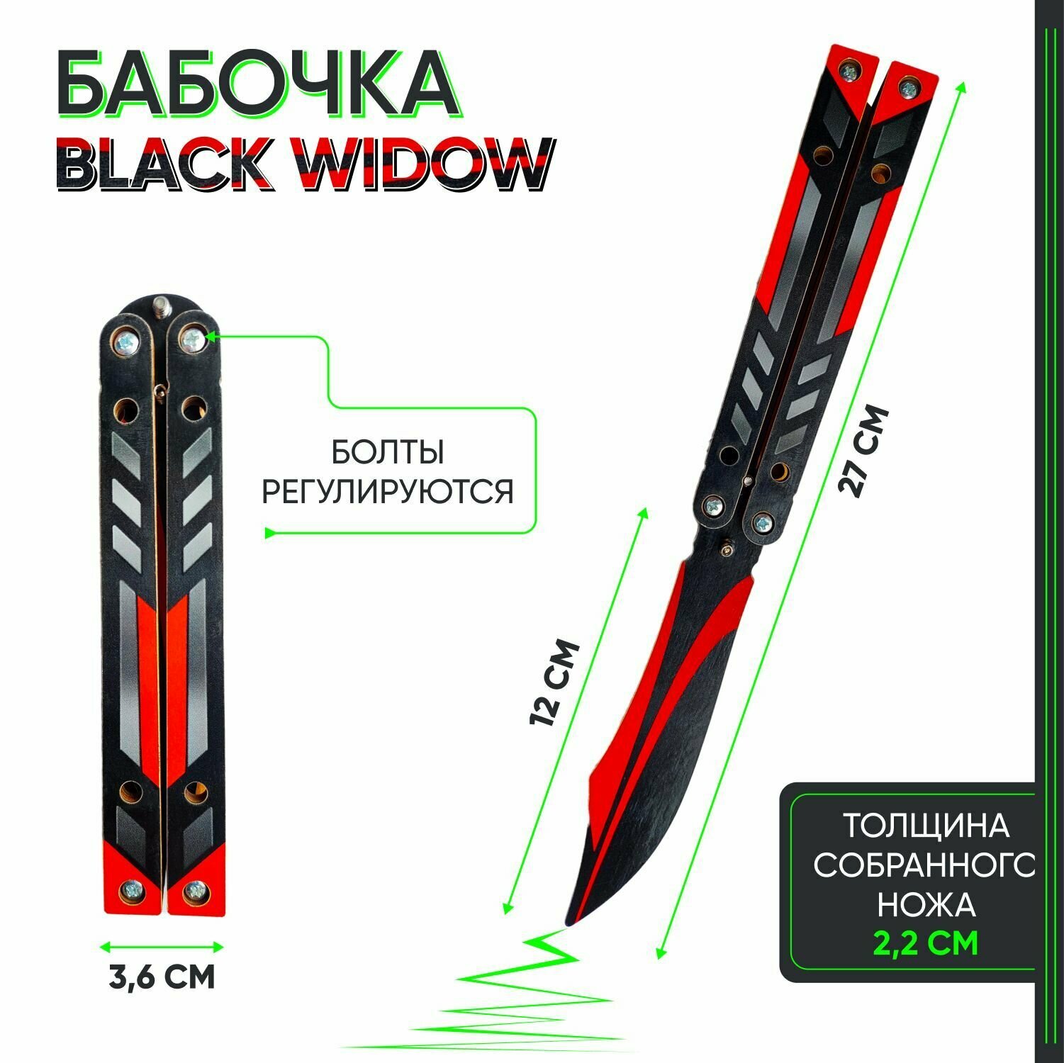 Нож бабочка детский в скине Black Widow – это складной нож игрушечный с клинком из cn’yljaa 2. При открывании половинки рукояти совершают оборот в противоположном направлении относительно клинка.