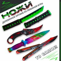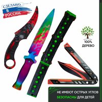 Игрушечные ножи изготовлены из прочной деревянной основы, без острых углов, тщательно отшлифованы. ЭКО материалы высокого качества не имеют посторонних запахов. Скины напечатаны стойкими нетоксичными краскам. Игровое оружие покрыто защитной пленкой, чтобы избежать истирания.