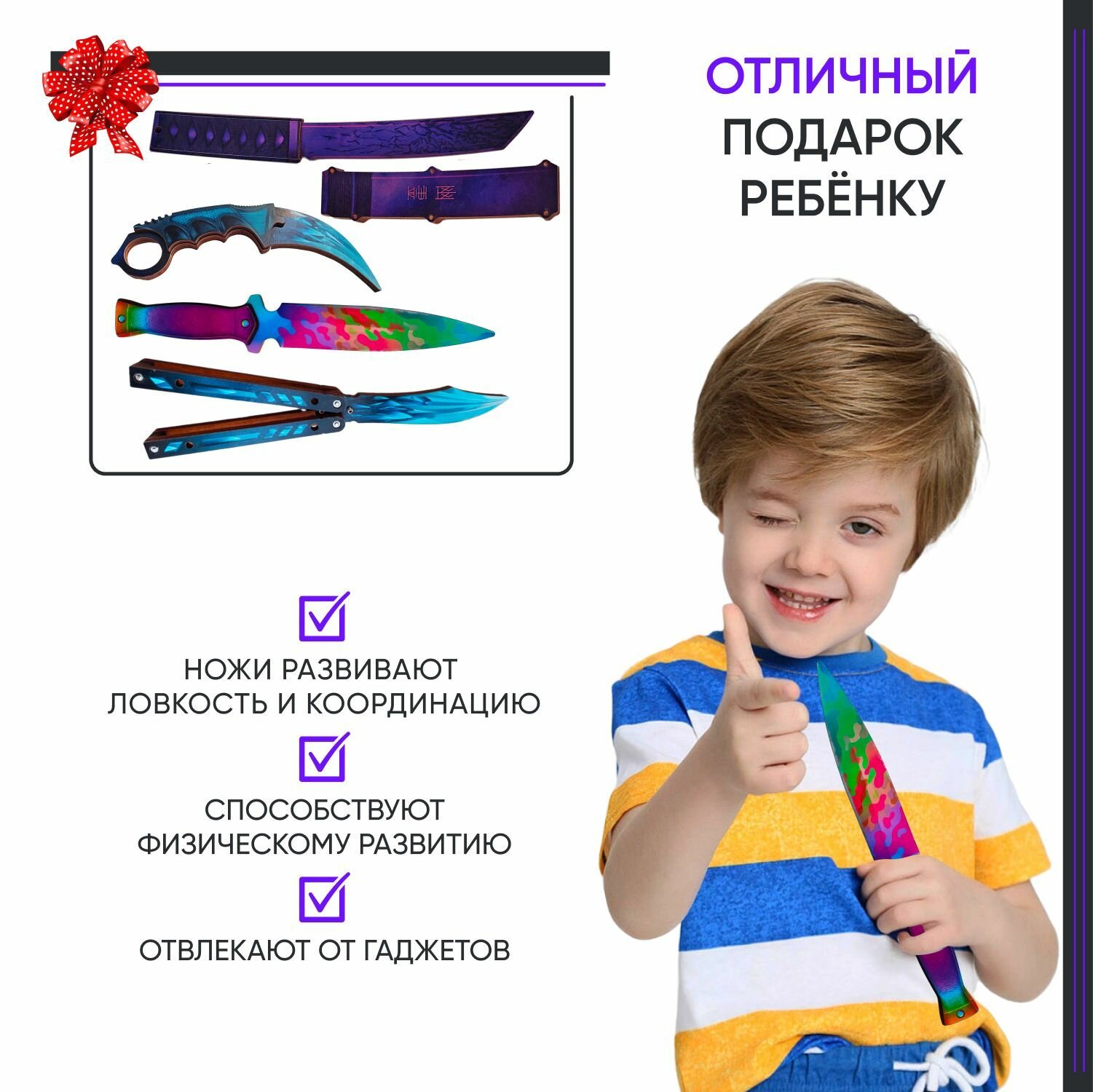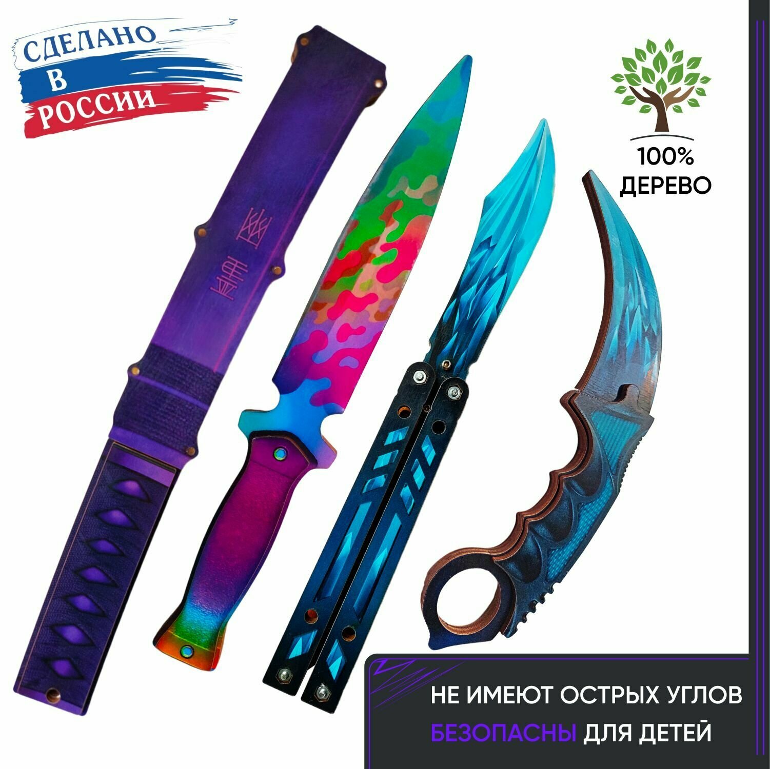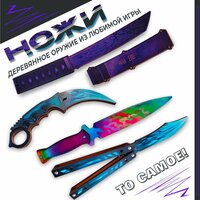 Игрушечные ножи изготовлены из прочной деревянной основы, без острых углов, тщательно отшлифованы. ЭКО материалы высокого качества не имеют посторонних запахов. Скины напечатаны стойкими нетоксичными краскам. Игровое оружие покрыто защитной пленкой, чтобы избежать истирания.