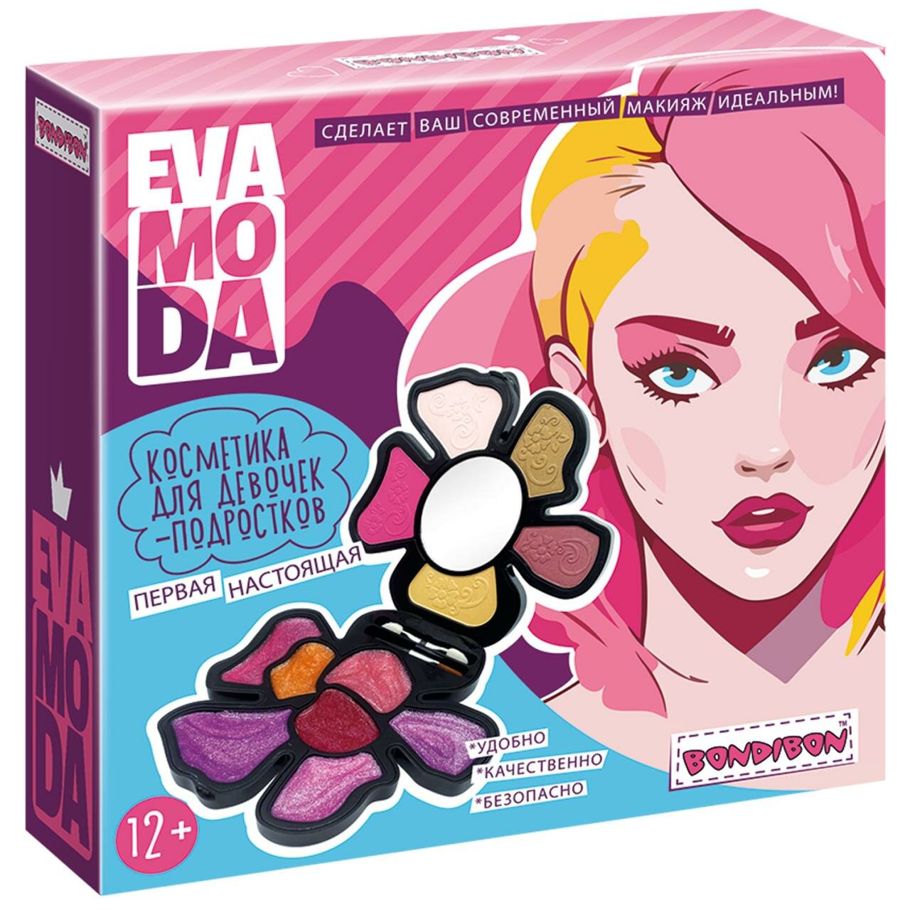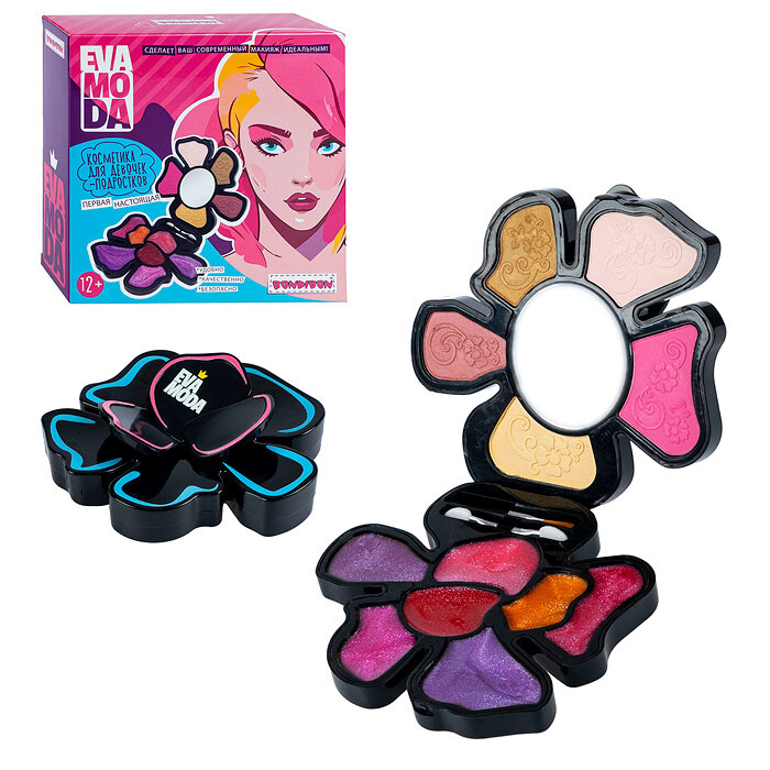 Стильная раздвижная косметичка с зеркалом создана специально для повзрослевших девочек! Набор декоративной косметики для подростков цветок серии Eva Moda от Bondibon поможет деликатно подчеркнуть индивидуальность при помощи теней, румян и блеска для губ. Откройте косметичку, рассмотрите все уровни и продумайте будущий макияж. Предварительно очистите кожу лица. Нанесите тени на веки при помощи удобного аппликатора. Добавьте нежные румяна на щечки и блеск на губы. Очаровательный образ готов! Творческий процесс нанесения макияжа развивает эстетический вкус, аккуратность и воображение. Компактную черную косметичку удобно брать с собой. Продукция Ева Мода от Бондибон сертифицирована и безопасна. Средства легко смываются теплой водой с мылом. В набор входят: тени для век 3 цветов, 2 оттенка румян, 7 блесков для губ, 2 аппликатора, зеркало. Возраст 12+ Набор первой настоящей косметики цветок – отличный подарок для девочки-подростка.