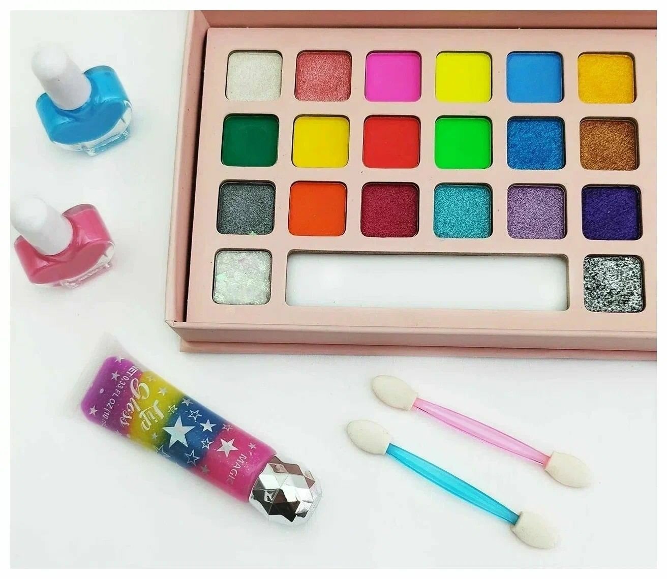 | Состав | Состав лака для ногтей: вода, сополимер стирола/акрилатов, полиэтилентерефталат, карбомер, сорбитан сесквиолеат, триэтаноламин, стерат магния, ДМДМ гидантоин. Состав теней для глаз: тальк, слюда, стеарат магния, минеральное масло, диоксид титана, гидроген |