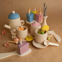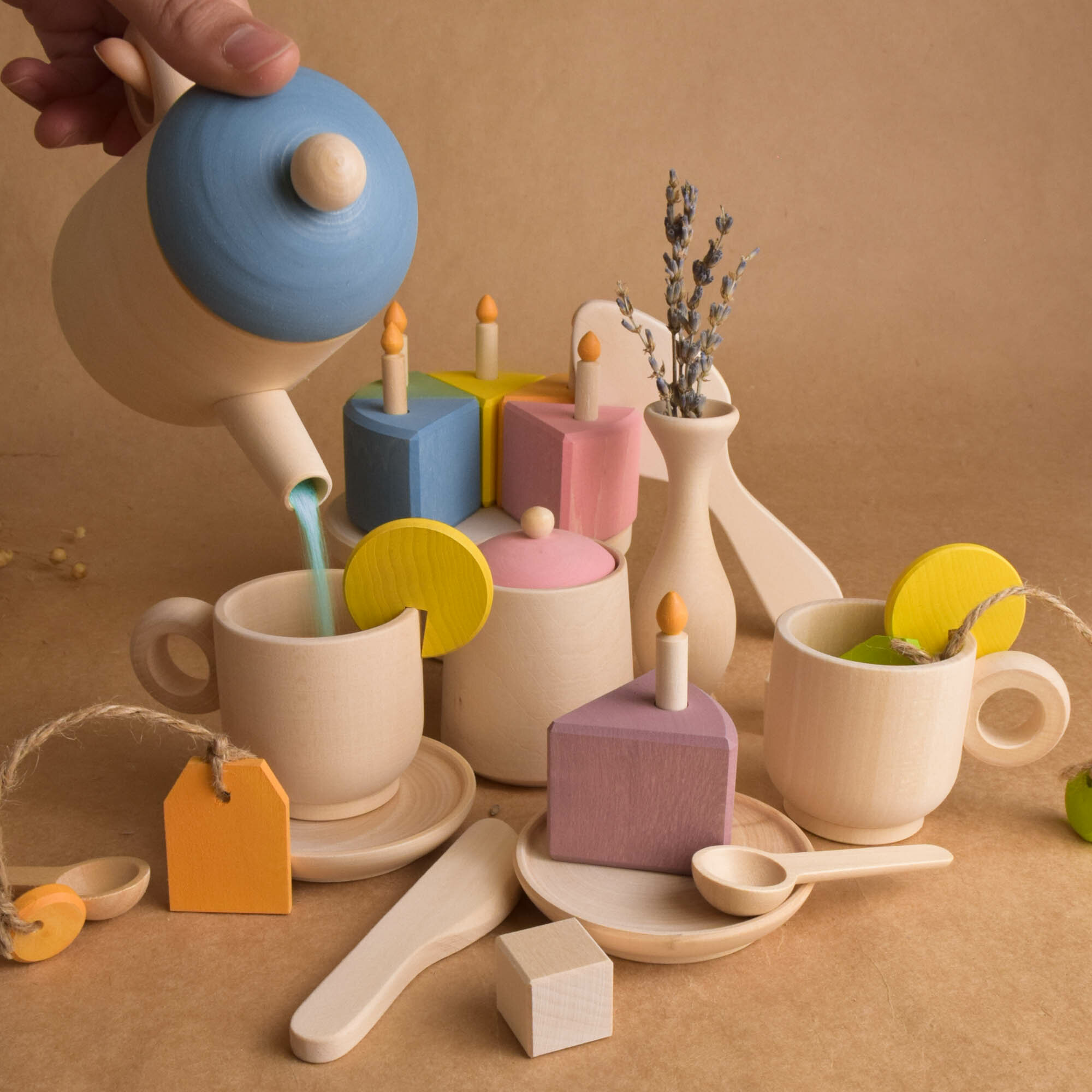 Набор деревянной детской игрушечной посуды в виде чайного детского сервиза с деревянным игрушечным тортом на подставке это детская эко игрушка развивайка для малыша, ребенка, девочки и мальчика от года до 7 лет. Деревянная развивающая игрушка ручной работы для детей, малышей, мальчиков и девочек по Монтессори является важной составляющей для гармоничного раннего развития и воспитания малыша, делающего первые шаги во взрослую жизнь. Сюжетно-ролевые развивающие игры с тактильно приятными, как будто теплыми, деревянными игрушками развивашками для раннего развития малышей способствуют развитию мелкой моторики, речи и фантазии ребенка! Набор детской посуды игрушечной для кукол - это отличная деревянная игрушка ручной работы, которая идеально подходит для игры в совместное чаепитие на игровой детской кухне и освоения разных социальных навыков среди которых одним из важнейших является делиться и заботиться о других: налить маме чай или напоить всех куколок и игрушек. Деревянная игрушечная посудка будет самым лучшим подарком на день рождения др или на новый год нг детям, малышу, ребенку 1 год, 2 года, 3 года, 4 года, 5 лет, 6 лет, 7 лет для девочки и мальчику! Уникальный набор детской посуды для игры ручной работы для девочек и мальчиков, позволит полностью погрузиться в атмосферу игру в чаепитие. Этот набор игрушечной посуды обязательно пригодится маленькой хозяйке на деревянной игровой детской кухне. Ребёнок в игровой форме сможет выучить названия самых распространенных предметов в чайном сервизе и освоит их применение, ведь только в нашем наборе у чайника в носике есть сквозное отверстие, через которое можно “наливать” манку. А после игры игрушечный детский чайный сервиз с тортом станет прекрасным элементом декора любой детской комнаты. Все предметы в игрушечном чайном сервизе для детей изготовлены из натурального дерева, гладко отшлифованы и покрыты натуральным цветным воском, который не скрывает неповторимой структуры натурального дерева и применяемый мировыми лидерами в изготовлении детских деревянных игрушек. На сегодняшний день цветной воск является одним из самых лучших и эко покрытий для детских деревянных игрушек. Цветной воск впитывается в поверхность дерева на несколько миллиметров и позволяет сохранить и подчеркнуть неповторимый узор текстуры дерева. Поэтому деревянные игрушки для детей очень тактильно приятны. В детский набор игрушечной деревянной посуды входит входит 19 предметов: чайник (7,5х12 см.) - 1 шт; сахарница (7х6 см.)- 1 шт; нож - 1 шт; лопатка - 1 шт; чашка (6х5 см.) - 2 шт; чайная ложка - 2 шт, кусочек сахара - 2 шт; чайный пакетик - 2 шт; ломтик лимона - 2 шт; блюдце для чашки - 2 шт; вазочка - 1 шт; подставка для торта - 1 шт; торт из 6 кусочков (диаметр 10 см.) - 1 шт. Все наборы нашей детской деревянной посудки отлично сочетаются друг с другом.
