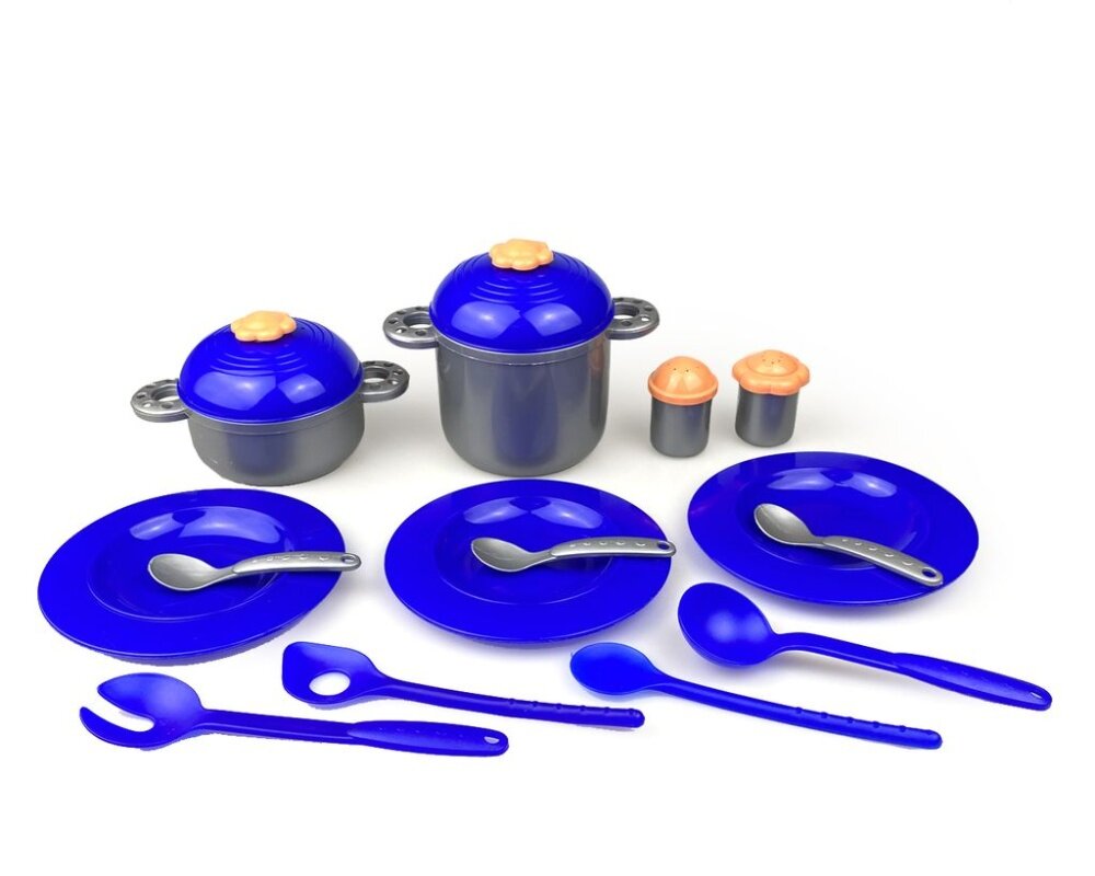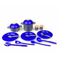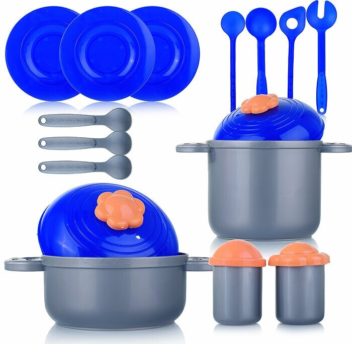Набор включает в себя: 2 горшка разных размеров с крышками, 3 тарелки, 2 салатницы, 2 столовых ложки, 1 вилку.