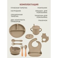 тарелка секционная-1шт, нагрудник-1шт, глубокая тарелка-1шт, поильник-1шт, крышка для поильника, трубочка-1шт, 2 комплекта приборов, грызунок-1шт