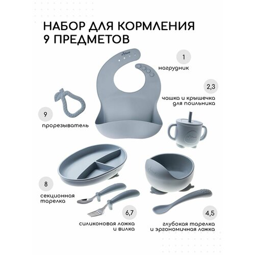 Набор для кормления силиконовый из 9 предметов подходит для детей от 4 месяцев до 7 лет. Комплект включает: тарелку на присоске, кружку - непроливайку с крышкой и трубочкой, нагрудник с большим кармашком, секционную тарелку для раздельного питания с высокими бортиками. Силиконовая посуда детская подходит для новорожденных девочек и мальчиков, для их кормящих мам, которые будут помогать малышам приобрести навыки аккуратного питания. Тарелочка на присоске, куда можно положить вкусную кашу, имеет безопасные закругленные края и надежно фиксируется, что обеспечивает безопасность и предотвращает опрокидывание. Секционная тарелка - мисочка выполнена с разными отделениями, ограниченными стенками - разделителями для сортировки пищи, в них удобно положить разные продукты, что выглядит эстетично и способствует повышению аппетита у малыша. Глубокий стаканчик - кружка овальной формы с дополнительной крышкой и отверстием для трубочек удобен для молока, молочных и фруктовых напитков. Силиконовый нагрудник для кормления имеет большой кармашек, крепление с кнопками и отверстиями позволяет адаптировать размер под шею ребенка, удобный, защищающий одежду ребенка фартук, используют вместо слюнявчика. Ложка для кормления безопасна для детских десен и зубов. Детская ложечка для кормления имеет небольшой объем, ее можно кусать и жевать вместо грызунка, мягкое покрытие не травмирует десны. Детский набор посуды подходит для самостоятельного приема пищи малышом. Кухонные столовые приборы можно ставить в микроволновую печь (микроволновку) для разогрева еды. Их можно мыть в посудомоечной машине и положить в холодильник на кухне. Силиконовый набор для кормления удобно брать с собой в дорогу и путешествие на автомобиле или автобусе, в поезде или самолете, для отдыха на даче или пикника на свежем воздухе на природе. Идеальный для первого прикорма набор из легких и удобных компонентов - аксессуаров в подарочной упаковке - практичный подарок на годик, для мамы и малыша. Сертифицировано в России.