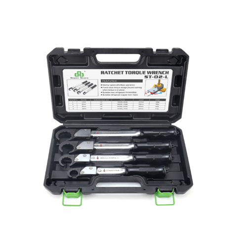 Набор динамометрических ключей с храповым механизмом Super Stars ST-02-L предназначен для удобного затягивания гаек в труднодоступных местах на блоках сплит-системы. Набор включает 4 ключа, кейс. Подходит для диаметров: 1/4", 3/8", 1/2", 5/8". Характеристики и преимущества: Фиксация и звуковое предупреждение при прокручивании; Храповая головка из углеродистой стали; Нескользящая рукоятка; Корпус высочайшей прочности; Твердый зажим; Удобное использование в узких пространствах; Упрощает процесс монтажа. Ключи: Диаметр 17 мм, резьба гайки 1/4", длина 217 мм, вес 335 г. Диаметр 22 мм, резьба гайки 3/8", длина 252 мм, вес 395 г. Диаметр 26 мм, резьба гайки 1/2", длина 263 мм, вес 440 г. Диаметр 29 мм, резьба гайки 5/8", длина 294 мм, вес 475 г.