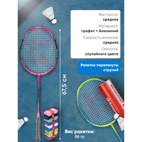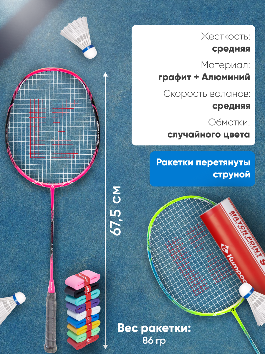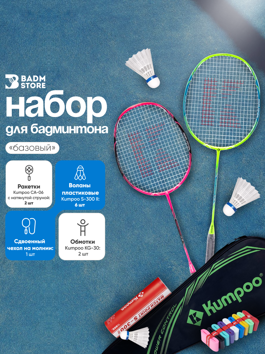 В базовый набор для игры в бадминтон входит снаряжение бренда Kumpoo. Он включает в себя 2 ракетки Kumpoo CA-06, перетянутые струной, недорогие пластиковые воланы (мячи) S-300 II и 2 обмотки KG-50 рандомного цвета. Вес универсальных ракеток для бадминтона с алюминиевым ободом и карбоновым стержнем составляет всего 86 г. Благодаря нейтральному балансу и средней жесткости они отлично подходят новичкам и любителям. При создании данной модели ракеток была использована технология NARROW SQUARE - обод ракетки изготовлен в особой, вытянутой форме, что позволяет увеличить игровое пятно и наделить характеристики ракетки наибольшей универсальностью. Набор для бадминтона подойдёт как для взрослой, так и для детской игры, если рост игроков выше 140 см. Также в состав входит 6 пластиковых воланчиков изготовленных из износостойкого нейлона. Головка — из пробково-полимерного композита. Обмотка толщиной 0,6 мм изготовлена из полиуретана. Поставляется в разных вариантах расцветки. Обеспечивает комфортный хват. Для базового набора бадминтониста подобраны изделия с невысокой ценой и в хорошем дизайне. Возврат товара надлежащего качества возможен, если защитная плёнка на ручке и пломба производителя на ней не повреждена.