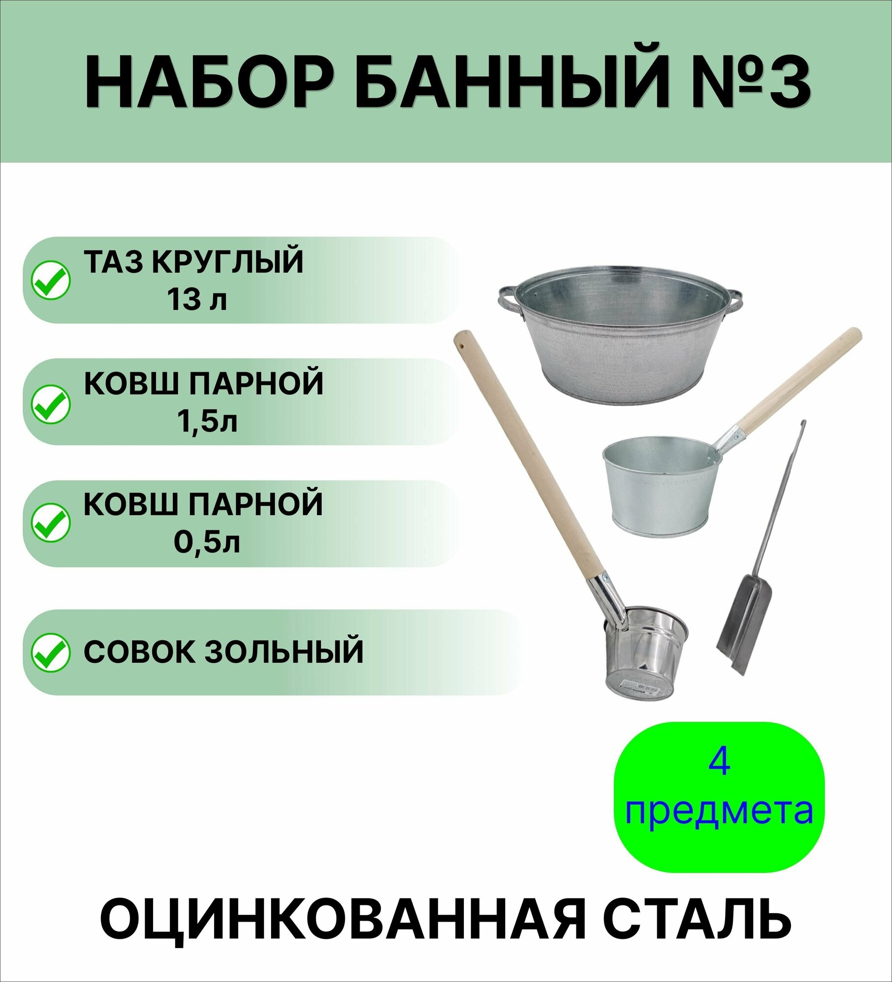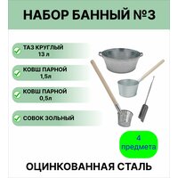 Набор банный: таз оцинкованный круглый 13 л; ковш банный 1,5 л; ковш парной 0,5 л; совок зольный