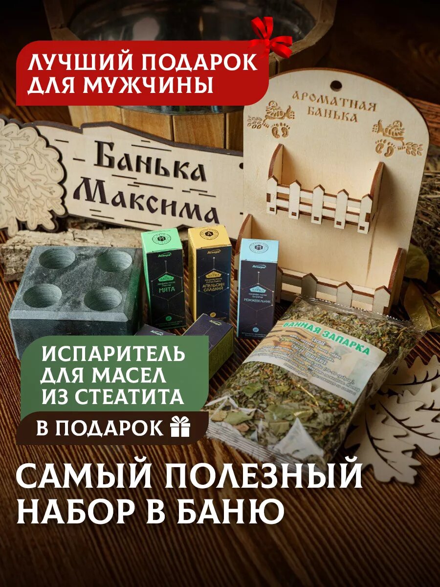 Хотите удивить подарком своего любимого мужчину ? Наш подарочный набор мужчине - лучшее, что вы сможете найти! Подарочный набор для бани и сауны подойдет тем, кто любит русскую баню и заботится о своем здоровье, ведь в банном наборе найдется все необходимое - настоящие эфирные масла аптечного производства 5 шт (эвкалипт, мята, можжевельник, апельсин, сосна), деревянная полочка для масел, 5 листиков для ароматизации бани или любого другого помещения (необходимо налить немного масла на поверхность листика и оставить для придания приятного аромата комнате) , испаритель аромамасел из настоящего камня - стеатита, банная запарка и именная табличка в баню. Банные принадлежности - это всегда актуально и модно. Это те аксессуары, которые обязательно будут использоваться на постоянной основе. Набор банный или набор в баню не обходится без масел для бани - у нас эфирные масла отличного качества, не разбавленные водой! Данный набор можно приподнести на день рождения или юбилей папе, мужу, дедушке, другу. Хотим заметить, что именные подарки (а особенно именной набор для бани) вызывают ВАУ-эффект и очень запоминаются. Обязательно приобретите наши банные штучки и благодарность мужчины вам обеспечена! Важно - камень для аромамасел (испаритель из стеатита) имеет 2 дизайна - в темном цвете и гладкий или светлый и под вышербленный кирпич (приходит рандомно).