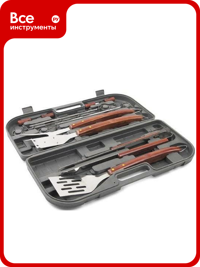 Все аксессуары: лопатка, щипцы, вилка для барбекю и другие предметы организованно размещаются и надежно закрепляются в удобном, компактном пластиковом кейсе. Походный набор для барбекю занимает совсем немного места, поэтому вы можете взять его с собой в пеший поход для отдыха на природе.