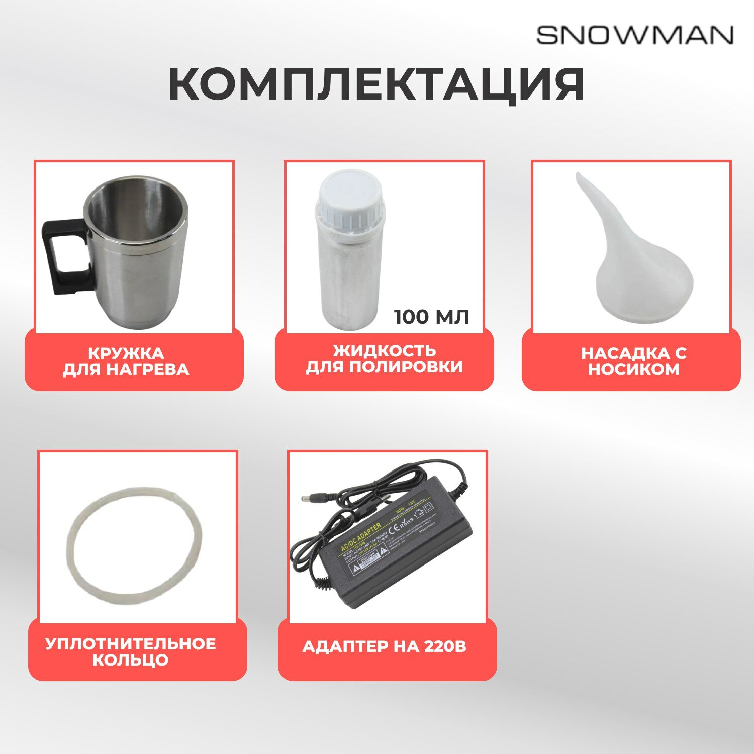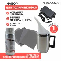 | Способ применения | Перед началом полировки паром необходимо обязательно подготовить фару. Для этого нужно пройтись наждачной бумагой разной зернистости, пока поверхность не станет матовой. Зернистость шкурки зависит от состояния фары. В основном используют наждачную бумагу зернистостью в мкм. Первый этап - это грубая шкурка 250-315 мкм. Второй этап – 125-160 мкм. Третий этап – 50-80 мкм. При шлифовке шкуркой рекомендуется смачивать фару водой во избежание глубоких царапин. После обработки наждачной бумагой необходимо обезжирить, а также покрыть малярным скотчем детали кузова вокруг фары. Поверхность должна быть сухой. Затем налить жидкость для полировки в нагревательную кружку, подключить к питанию и подождать пока из носика кружки не пойдет пар. Начните обработку фары снизу вверх. Носик кружки держите на расстояние примерно 1 см. от фары.Важно! Температура в помещении должна быть выше 12 градусов по Цельсию, а также обязательна предподготовка фары к полировке паром, иначе результат от полировки может быть неравномерным. |