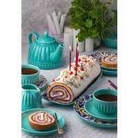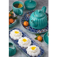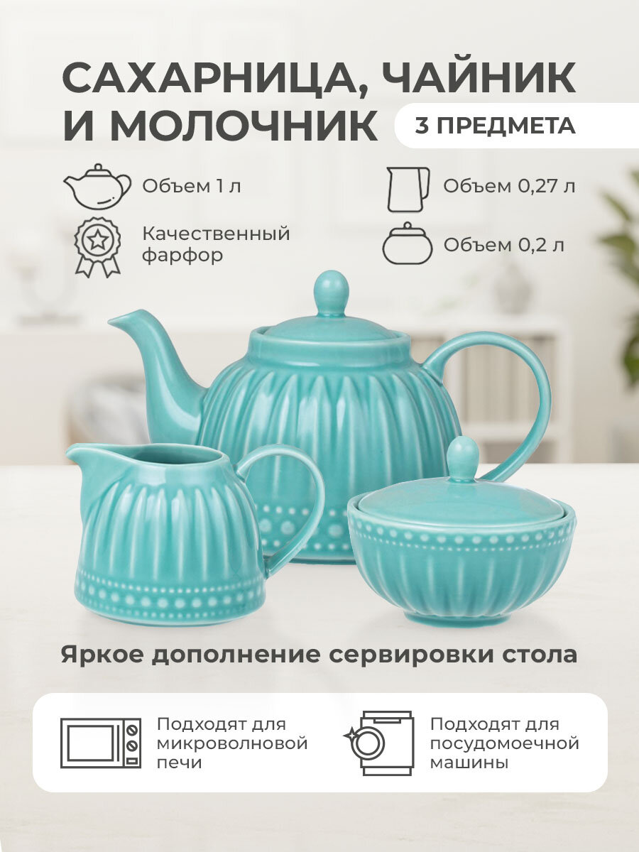 Набор для чаепития состоит из чайника заварочного с крышкой, сахарницы с крышкой и молочника. Набор из заварочного чайника, сахарницы и сливочника изготовлен из фарфора. Чайник заварочный: объем 1000мл (1л), высота с крышкой 15см. Сахарница с крышкой: объем 200мл, высота 8см. Молочник: объем 270мл, высота 8см. Эту фарфоровую посуду можно использовать для хранения в холодильнике и морозильнике, мыть в посудомоечной машине, использовать в микроволновой печи (СВЧ). Красивая посуда для кухни – неотъемлемый элемент интерьера дома. Коллекция посуды "Beautiful patterns" воплощает в себе единение классических глубоких однотонных расцветок и затейливых узоров, запоминающихся изяществом и яркостью красок. Набор для чаепития с чайником, сахарницей фарфоровой и сливочником украшен рельефным декором в виде разнообразных бороздок и поясков. Чайник заварной (заварник для чая) фарфор, молочник фарфоровый и сахарница имеют снаружи яркий бирюзовый цвет и глянцевое покрытие. Глазурь защищает поверхность от механических повреждений, придавая красивый блеск. Набор чайник и сахарница, и молочник не только украсит праздничный стол, но создаст домашний уют и гармонию. Дополните его пиалами (маленькими салатниками) из одноименной коллекции, и у Вас получится красивый чайный набор. Разнообразные предметы из коллекции подходят не только для сервировки стола, но для подачи блюд и чаепития. Вы можете собрать красивый чайный сервиз или обеденный сервиз из набора тарелок для салата, чайных пар, салатников, тарелок и кружек. Стильная посуда подойдет не только для домашней кухни, но и для кафе и ресторана. Набор посуды для кухни – это отличная идея для подарка! Сделайте подарок для коллеги, подберите посуду для чаепития в подарок подруге, сестре, маме и бабушке. Красивая посуда для сервировки – это отличный подарок на 23 февраля, праздник 8 марта, Пасху, Новый год и Рождество, день рождения, юбилей, новоселье.