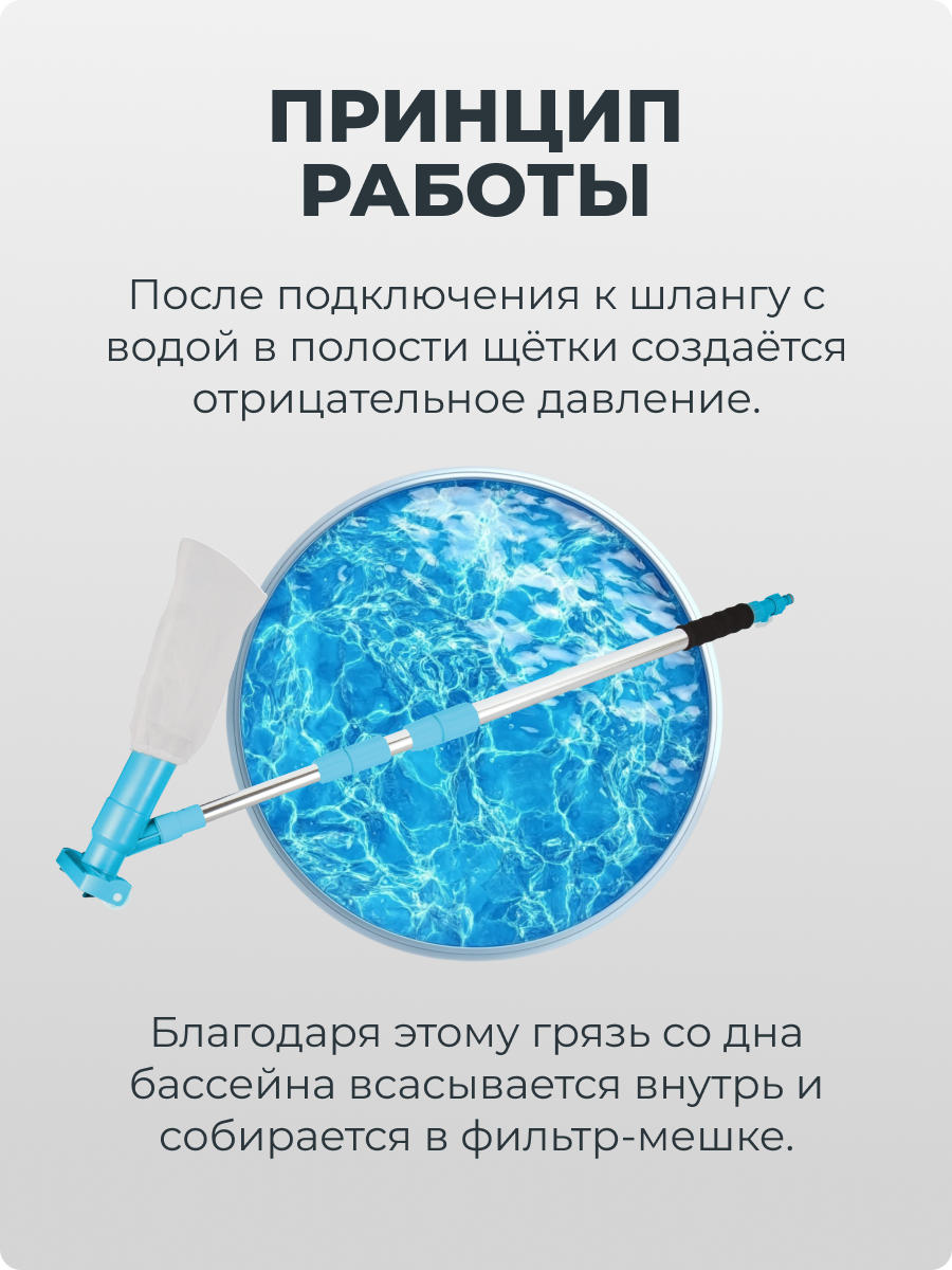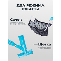 Набор для чистки бассейна – необходимый помощник в уходе за вашим бассейном, включающий в себя высокоэффективные приспособления для поддержания чистоты воды, дна и стенок бассейна. Набор для очистки бассейна можно использовать в двух режимах работы: сбор грязи со дна бассейна и сбор грязи с поверхности воды. В комплект входит: щетка очиститель с 3 мешками-фильтрами, которая позволит быстро, просто и качественно очистить стенки, дно бассейна, при помощи нижнего и бокового ворса; сачок из прочной мелкоячеистой полимерной сетки, позволяющей фильтровать как мелкие частицы, так и вылавливать крупный мусор, листья, насекомых. Так же в комплекте идет 3-ступенчатая телескопическая алюминиевая штанга (0,85 м - 1,8 м) с резьбой, которая позволяет достать до самых дальних уголков бассейна, подключается к фильтрующему насосу с помощью шланга, который приобретается отдельно от набора. Принцип работы: насадка-пылесос присоединяется к садовому шлангу и опускается на дно бассейна, где напором воды поднимается осевшая грязь. Пылесос для бассейна фильтрует воду, осаживая загрязнения в специальном мешке для сбора мусора. Обе насадки, щетка и сачок, легко крепятся на телескопическую ручку. Комплект для чистки подходит для всех типов бассейнов, как закрытых, так и открытых: надувных, сборных, стационарных.