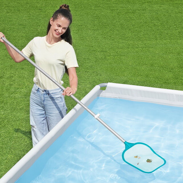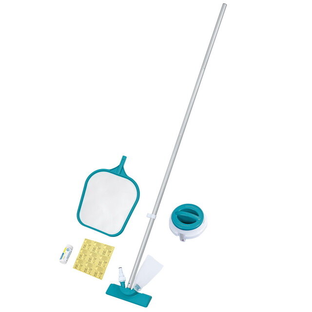 Комплект для очистки бассейнов от Bestway обеспечит комплексный уход за вашим надувным или каркасным уличным водоемом. Набор включает в себя две насадки: сачок легко справляется с мусором на поверхности воды, а вакуумный пылесос, подключающийся к садовому шлангу, эффективно работает на дне и стенках бассейна. Насадки закрепляются на регулируемой по длине штанге, благодаря чему вы сможете достать даже до самых труднодоступных мест. Особенностью набора является наличие тест-полосок для измерения уровня ph воды, а также дозатора для чистящих средств и комплекта заплаток для ремонта бассейна.