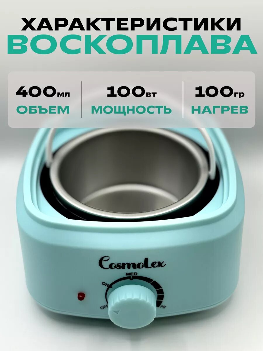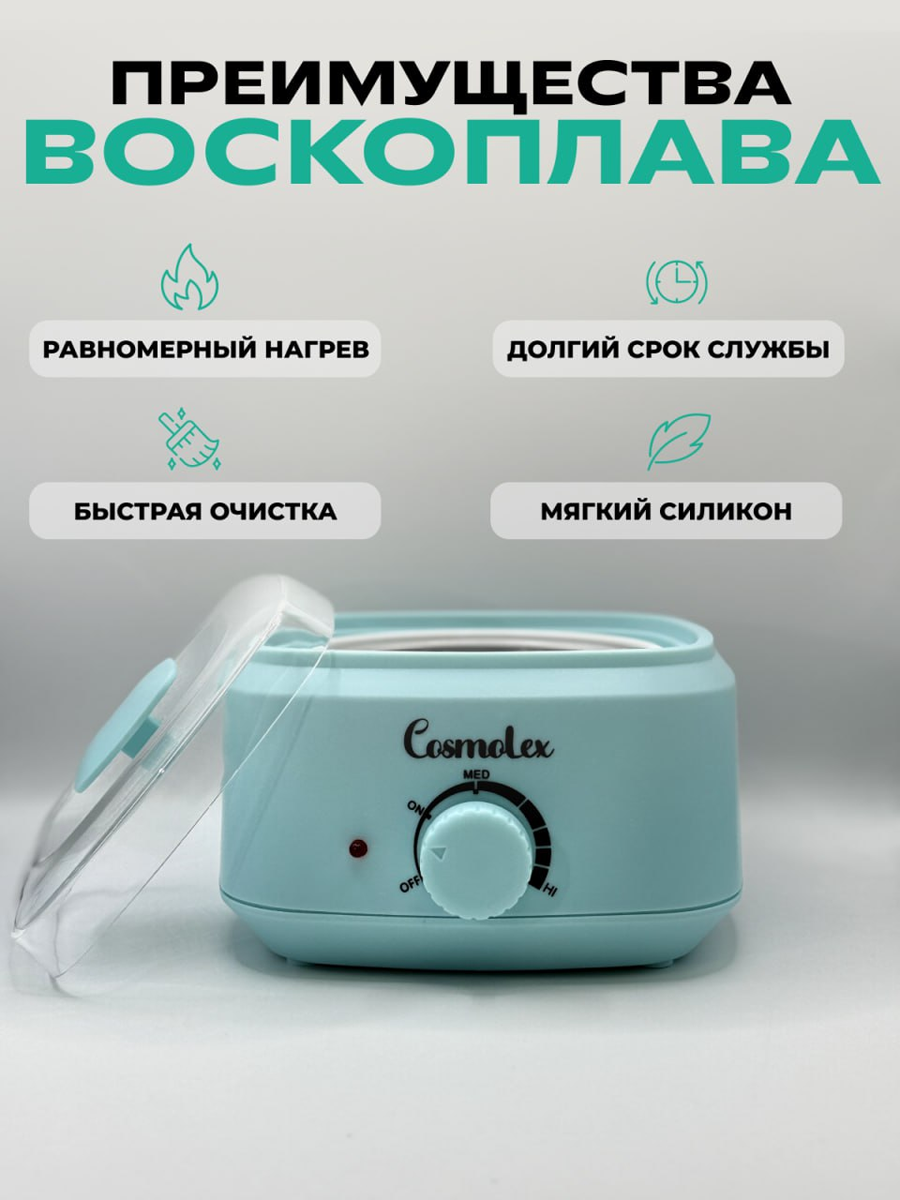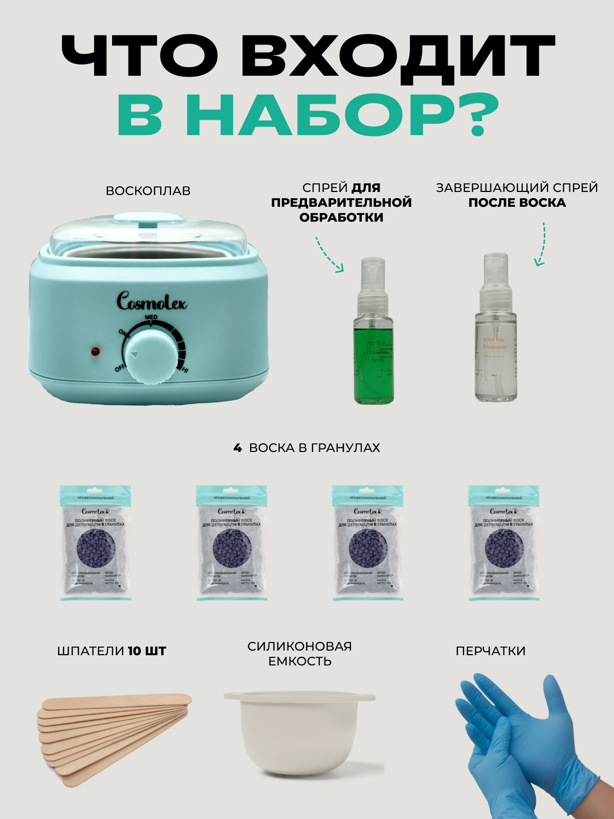Стартовый набор для депиляции Cosmolex включает в себя: Воскоплав баночный-400 мл. Дополнительная силиконовая ёмсость-400 мл. Воск в гранулах-4 шт.*100 г. Спрей для предварительной обработки- 30 мл. Завершающий спрей после воска(лавандовое масло) - 30 мл. Шпатели- 10 шт. Пара перчаток- 1 шт.