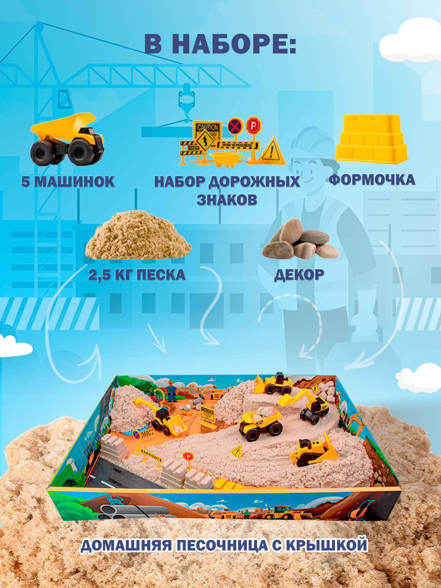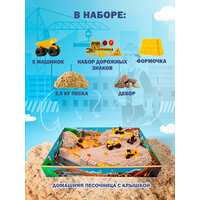 Набор включает в себя мелкий кинетический песок, позволяющий создавать различные формы и фигуры. Вместе с песком идут подвижные машинки, дорожные знаки, декор и формочка. Все это поможет ребенку легко создавать разные сюжеты игры – стройка, дорожные работы, замки.