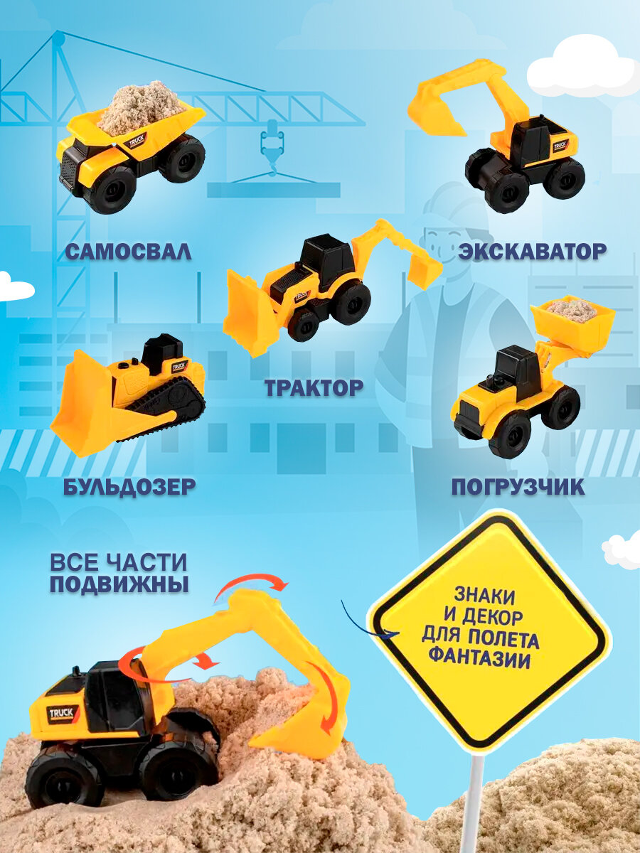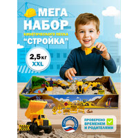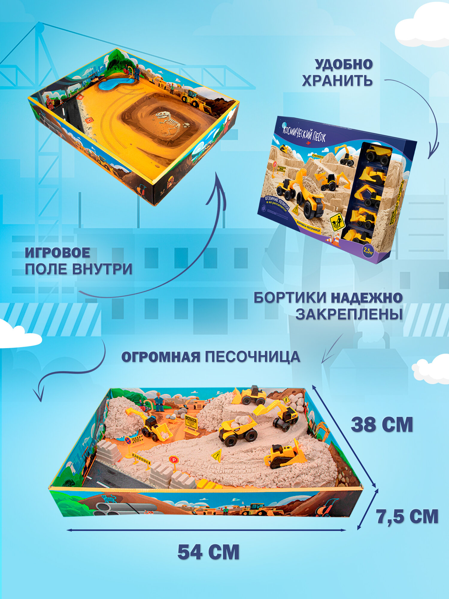 Детская игрушка кинетический песок «Стройка» с формочками для лепки и машинками - умный подарочный набор для творчества с космической песочницей. Это игра для детей 2 года, которая развлечет и обучит ребенка! С этим игровым набором 2,5 кг малыш сможет проводить часы веселой игры в игровой зоне для детей, развивая свою мелкую моторику.