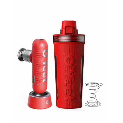 Набор для фитнеса O’Yeet включает в себя премиальный перкуссионный массажер NEX Mini и шейкер Shaker Bottle.