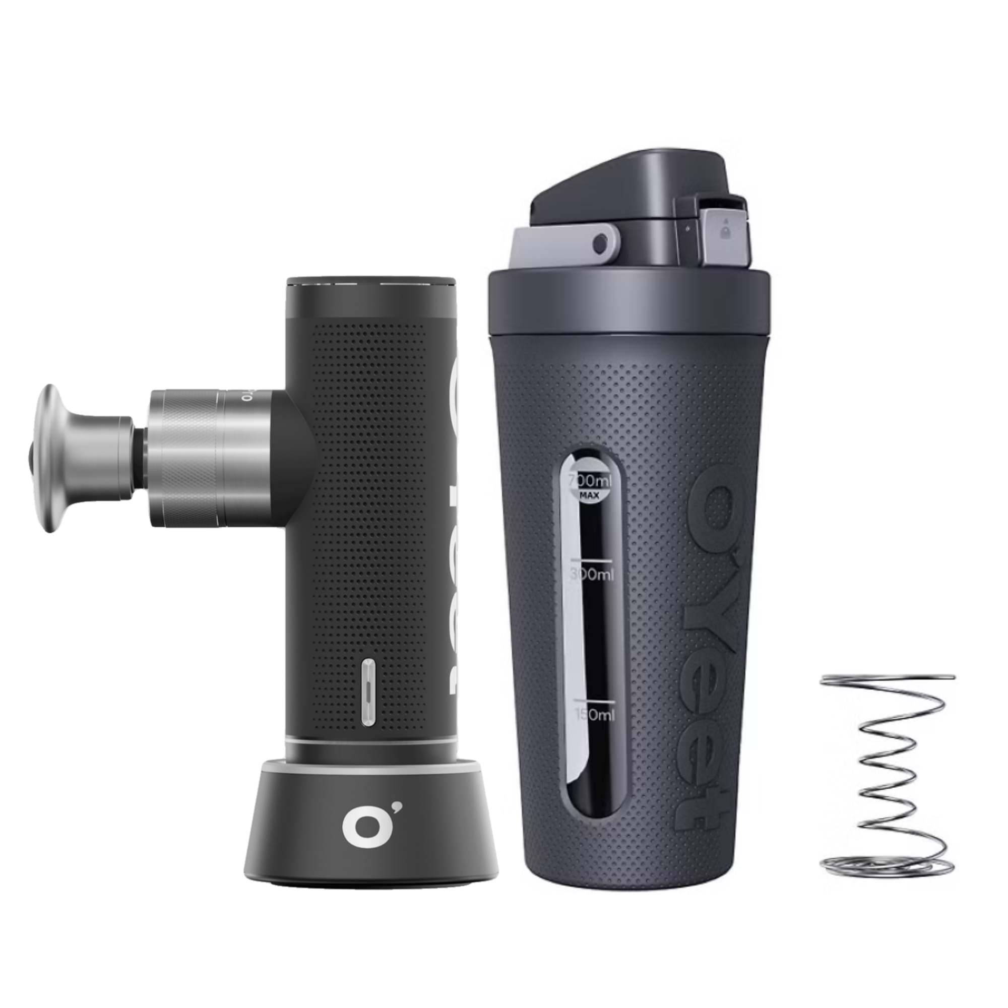 Набор для фитнеса O’Yeet включает в себя премиальный перкуссионный массажер NEX PRO 2 и шейкер Shaker Bottle.