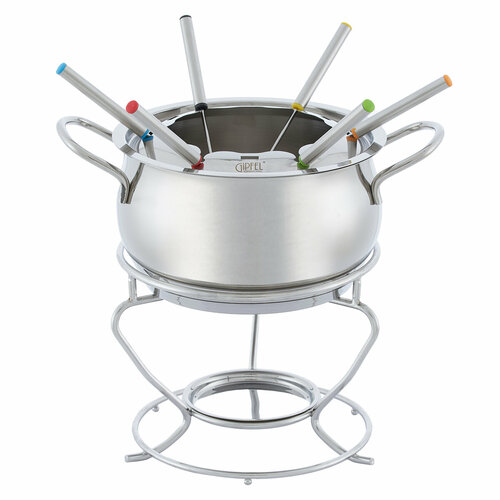 Набор для фондю Gipfel Gruyere 52435 состоит из 9 предметов: чаша 2,5 л с ручками, шпажки 6 штук, подставка под чашу, кольцо для шпажек.