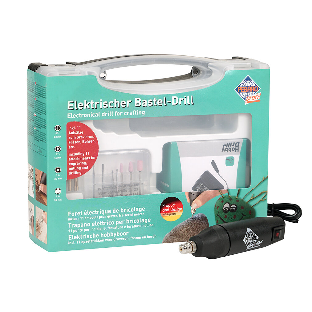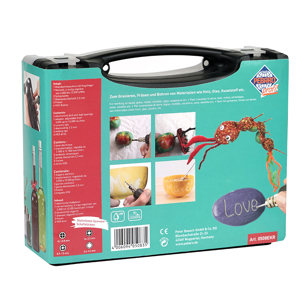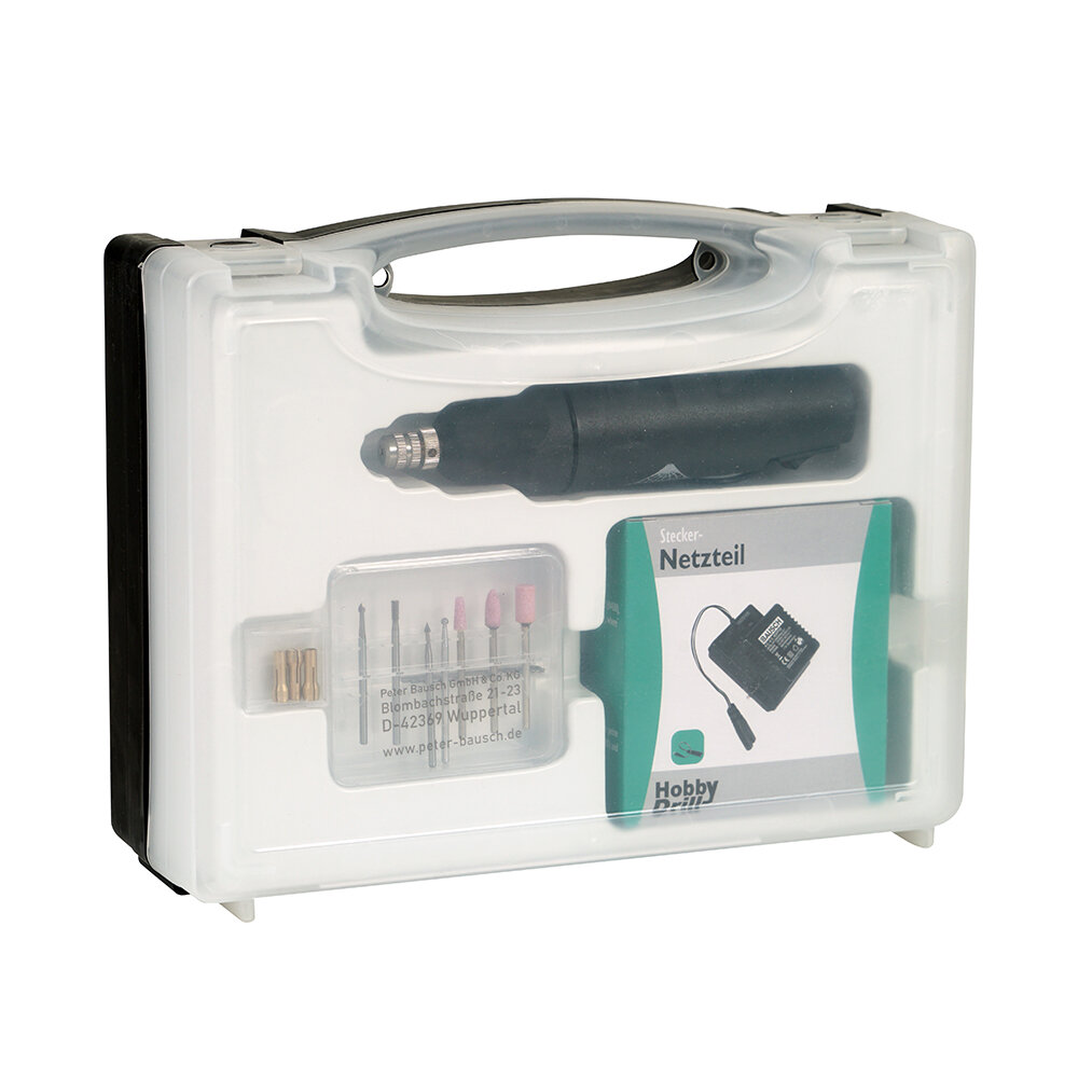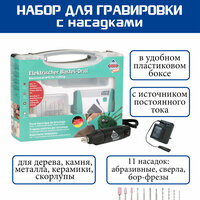| Комплектация | — 6 насадок (3 образивные насадки, 2 бор-фрезы, 1 шаровидный алмазный бор) — мини - дрель — источник питания со ступенчатой регулировкой напряжения 3 - 12 Вольт |