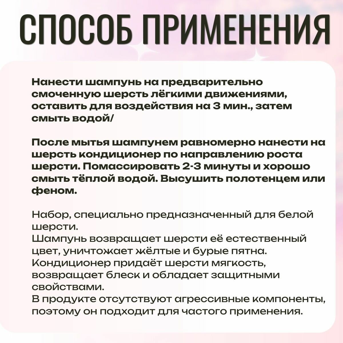 Бальзам, специально предназначенный для белой шерсти. Придаёт шерсти мягкость и обладает защитными свойствами. Удаляя желтизну, он возвращает естественный белый цвет и блеск шерсти.