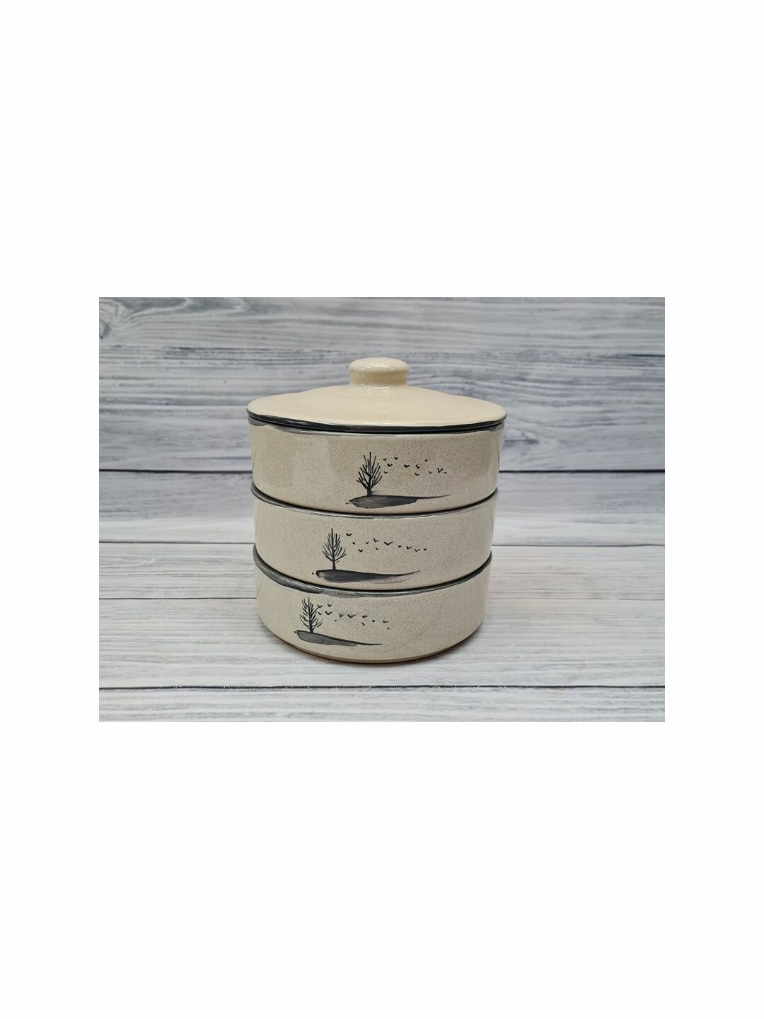 Изделие состоит из трех форм и одной крышки. Отлично подходит для приготовления заливного. Формы ставятся одна на одну и в холодильнике не занимают много места. При желании, емкости можно использовать самостоятельно для запекания продуктов, а также для сервировки и хранения продуктов. Изделие изготовлено из жаропрочной керамики, его можно использовать в духовке и микроволновой печи. Изделия расписаны вручную, поэтому могут немного отличатся от изображения на сайте. В набор входит: 3 емкости по 0,75л и крышка.