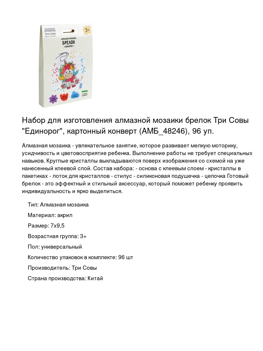 Купить Набор для изготовления алмазной мозаики брелок Три Совы «Единорог», картонный конверт (АМБ_48246), 96 уп. с доставкой по всей России. Набор для изготовления алмазной мозаики брелок Три Совы «Единорог», картонный конверт (АМБ_48246), 96 уп.: сравнение цен, характеристики, фото, актуальное наличие и цены.