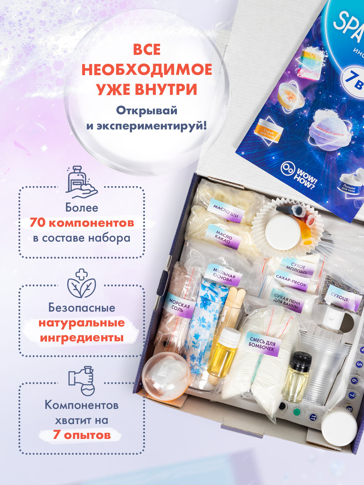 Кажется, никогда еще детские химические опыты не были столь полезны и практически применимы. Уверены: этот экспериментариум для юных химиков окупит себя стократ — он не только увлечет ребенка интересными научными опытами по занимательной химии (а в создании гигиенических средств ох как нужна научная точность и внимание!), но и поможет почувствовать себя настоящим творцом и одновременно исследователем.