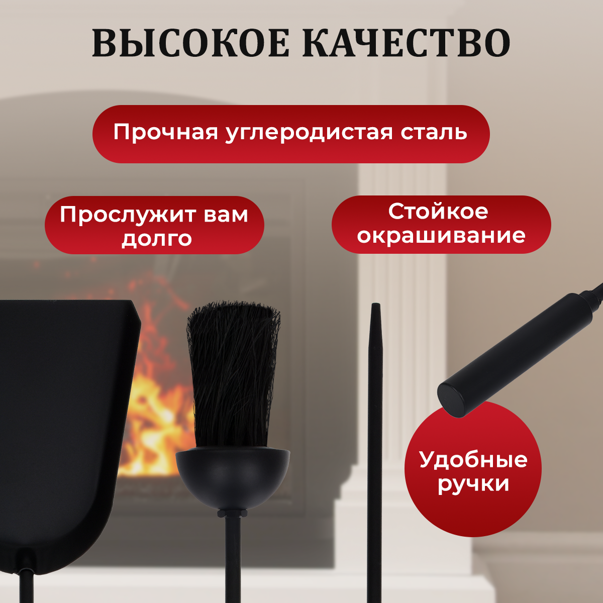 Преимущества: - Стильный дизайн - набор украсит интерьер и подчеркнет вашу индивидуальность. - Прочность - набор изготовлен из качественных материалов, что обеспечивает долговечность. - Удобство использования - все предметы легко помещаются в руке, что делает использование удобным. - Универсальность - набор подходит для использования в каминах, печах и мангалах. - Комплектация - в наборе есть совок, подставка для удобства хранения, кочерга для очистки золы и щетка для очистки поверхности от сажи.