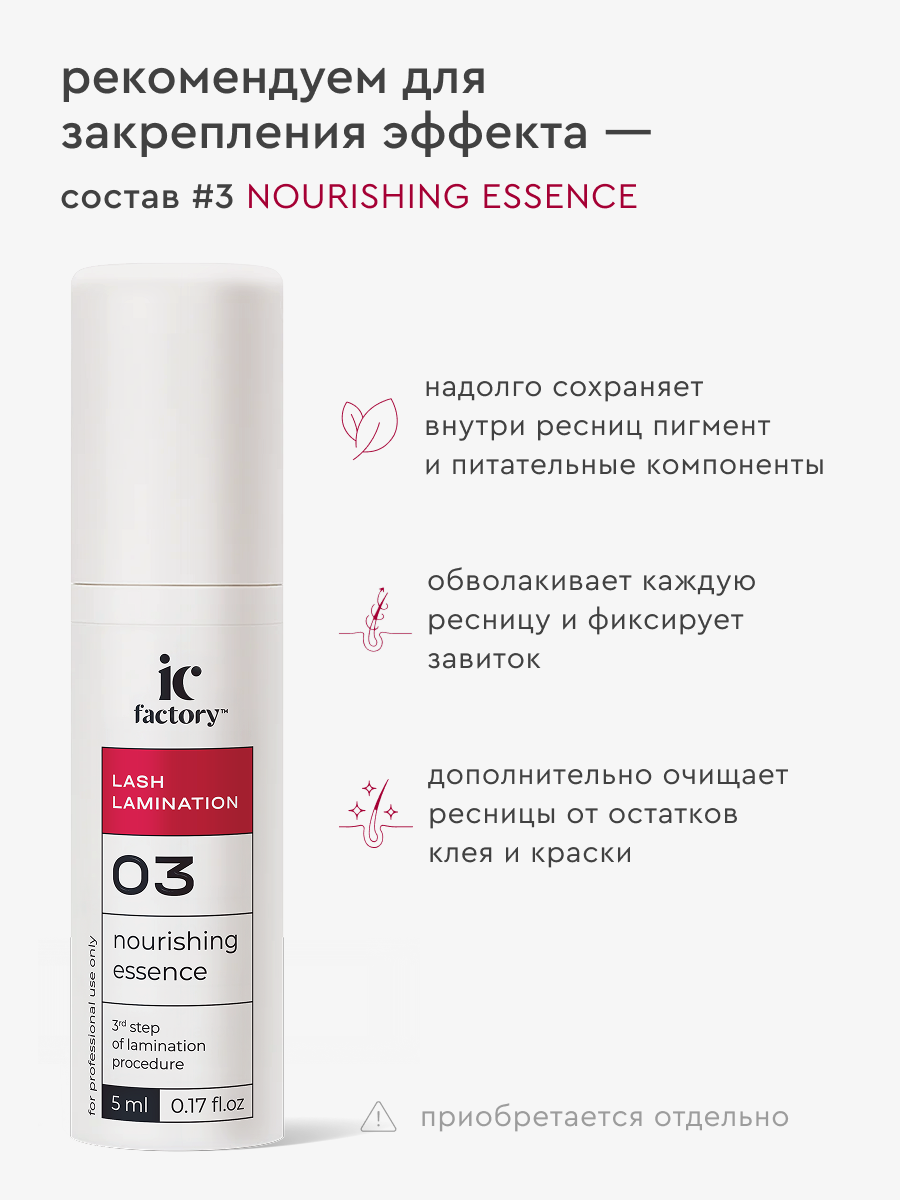 Популярные составы для ламинирования ресниц LASH LAMINATION IC FACTORY в одном комплекте! В комплекте саше с составом для ламинирования ресниц IC FACTORY ONE STEP BOND BUILDER! Обращаем ваше внимание, что для создания яркого завитка вам также понадобятся краска для бровей и ресниц BRONSUN и Состав #3 NOURISHING ESSENCE IC FACTORY для закрепления эффекта! LASH LAMINATION — это новый взгляд на ламинирование ресниц. Культовая процедура стала еще быстрее и бережнее! Набор для ламинирования ресниц включает: Состав #1 для ламинирования ресниц VOLUME LIFT, 5 мл - Используется на первом этапе ламинирования для формирования завитка. Активный компонент — цистеамин. Средство глубоко проникает в структуру волоса и бережно воздействует на дисульфидные связи. Состав #2 для ламинирования ресниц VOLUME FIXER, 5 мл - Используется на втором этапе ламинирования для фиксации завитка. Активный компонент — бромат натрия. Проникает в структуру волоса и фиксирует дисульфидные связи на длительный срок, укрепляет и восстанавливает ресницы, благодаря содержанию питательных компонентов. Одного набора хватает на проведение 30 процедур. Приобретая комплект у нас, вы совершаете выгодную покупку и получаете качественные составы. Перед упаковкой мы всегда проверяем целостность каждого флакона и срок годности, а также помещаем продукты в дополнительную упаковку для сохранности материалов в пути. В ассортименте бренда IC FACTORY есть все для ламинирования ресниц: составы, наборы и необходимые инструменты!